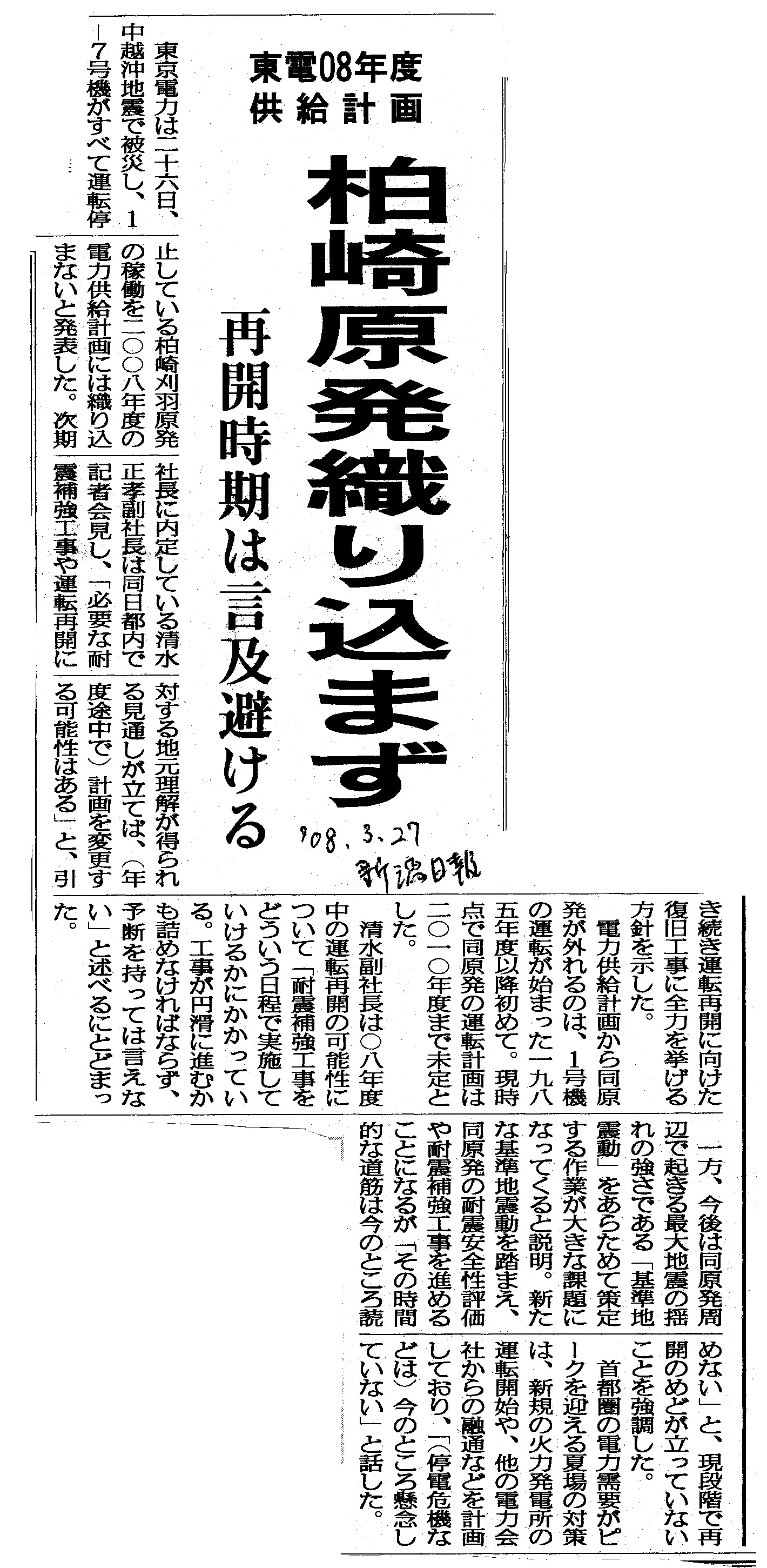 [2008_03_27_01]東電08年度供給計画 柏崎原発織り込まず 再開時期は言及避ける(新潟日報2008年3月27日)