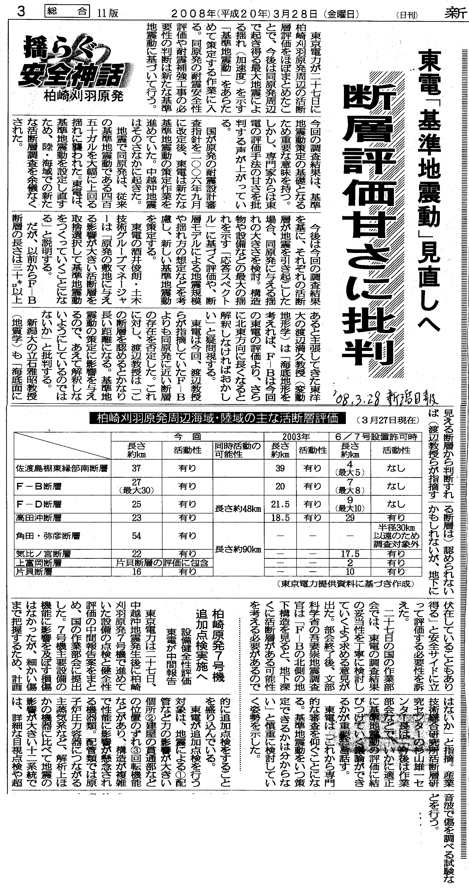 | [2008_03_28_01]揺らぐ安全神話 柏崎刈羽原発 東電「基準地震動」見直しへ 断層評価甘さに批判(新潟日報2008年3月28日) |