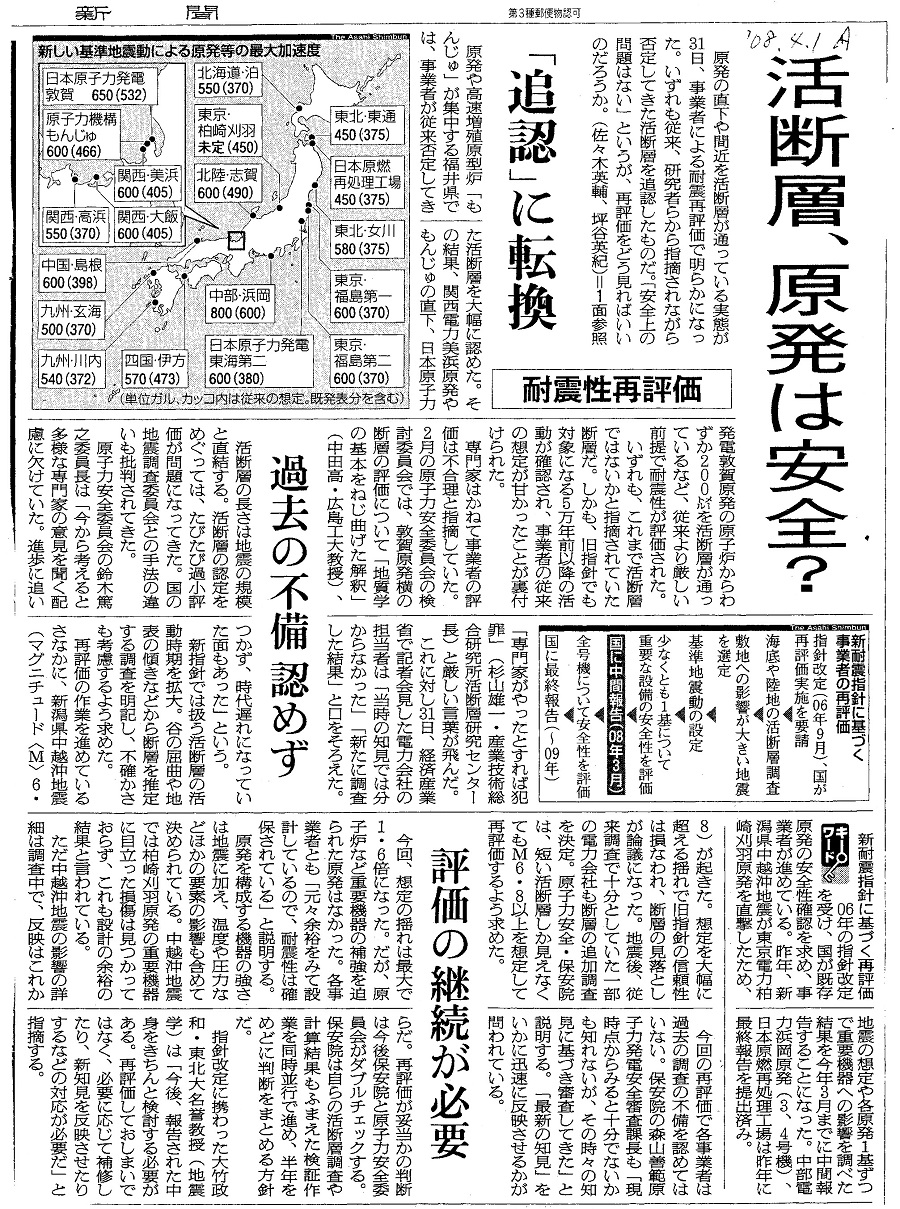 | [2008_04_01_01]活断層、原発は安全? 「追認」に転換 耐震性評価 過去に不備認めず 評価の継続が必要(朝日新聞2008年4月1日) |