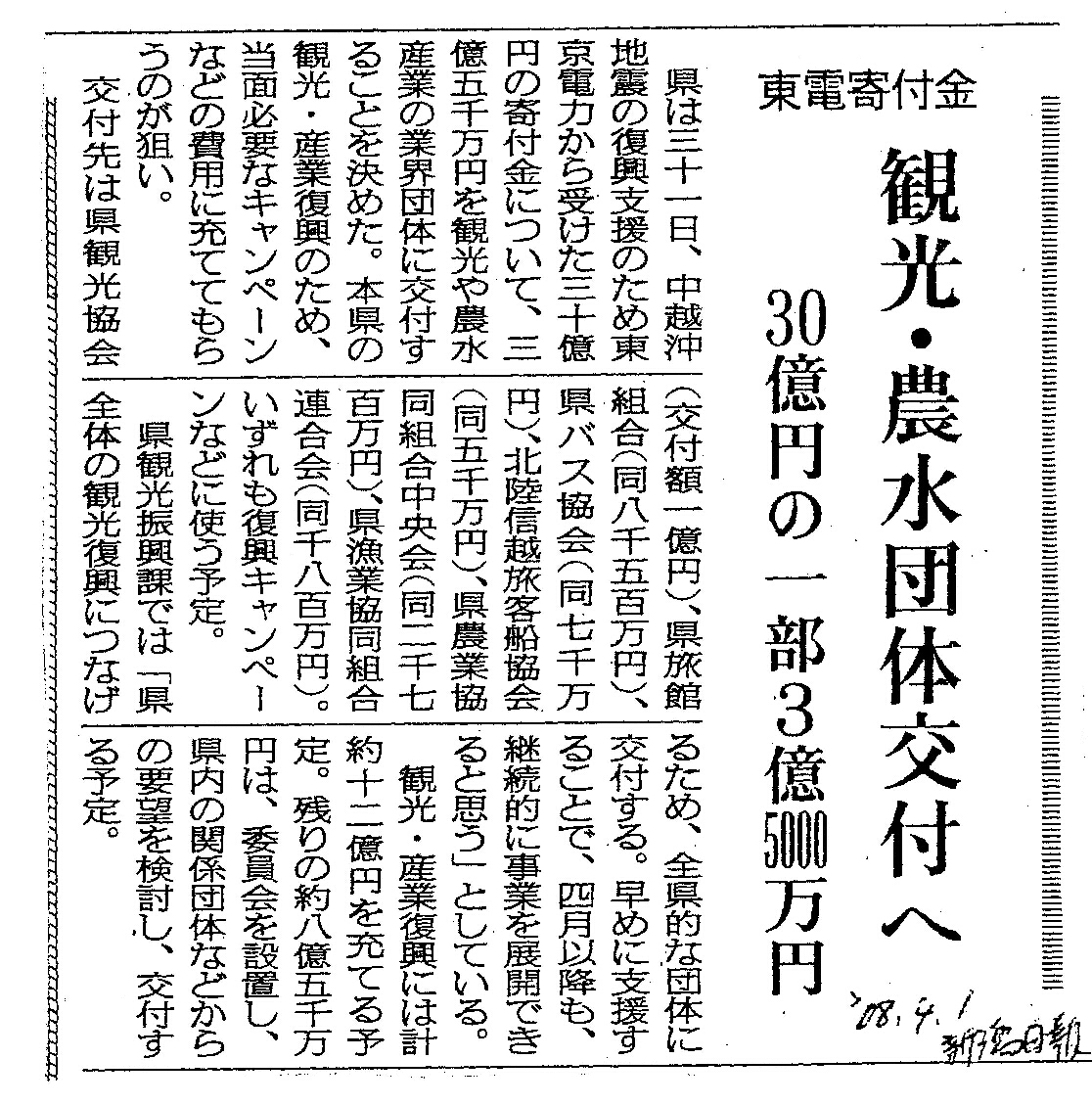 [2008_04_01_02]東電寄付金 観光・農水団体交付へ 30億円の一部3億5000万円 (新潟日報2008年4月1日)