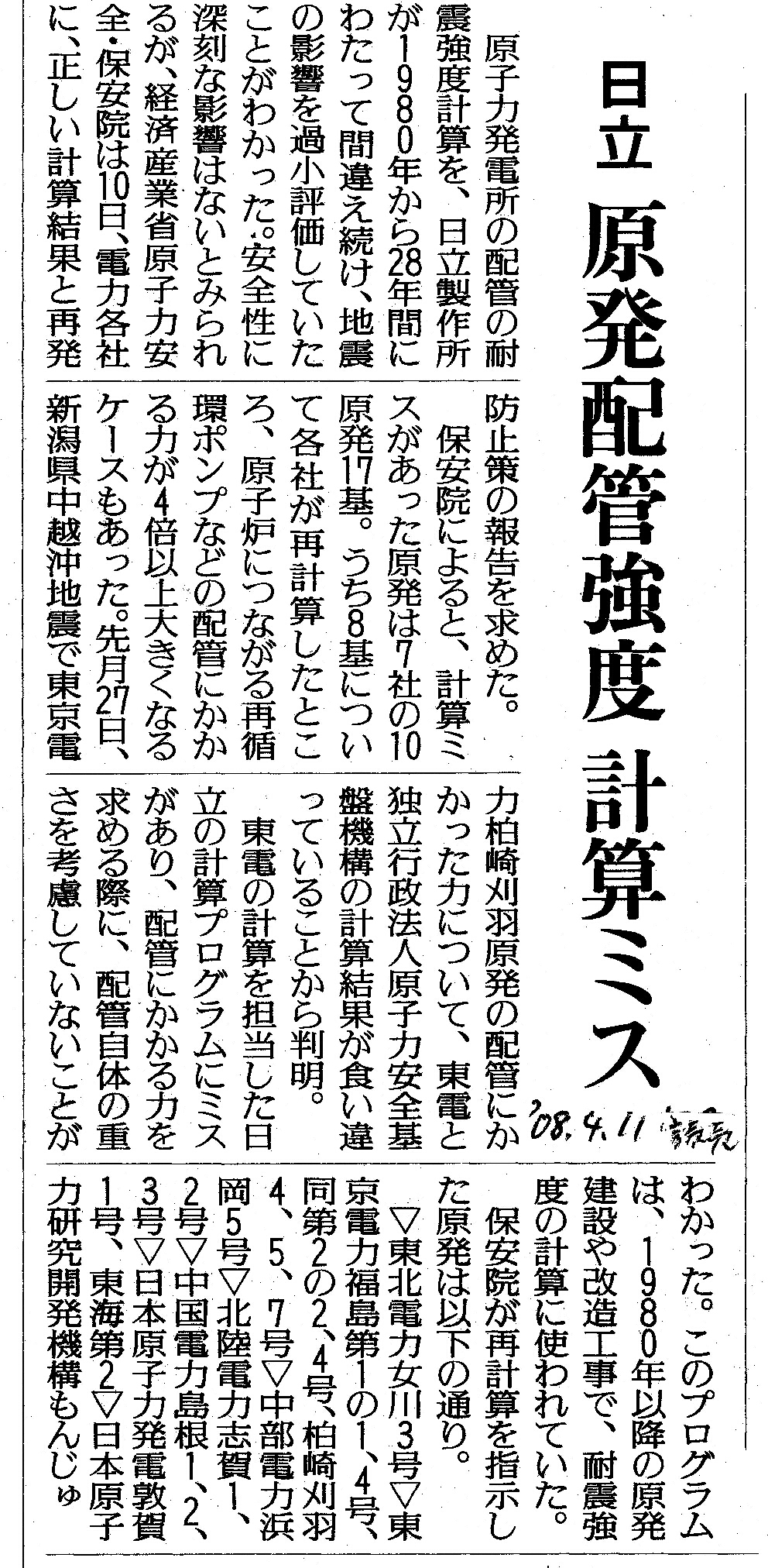| [2008_04_11_02]日立 原発配管強度 計算ミス(読売新聞2008年4月11日) |