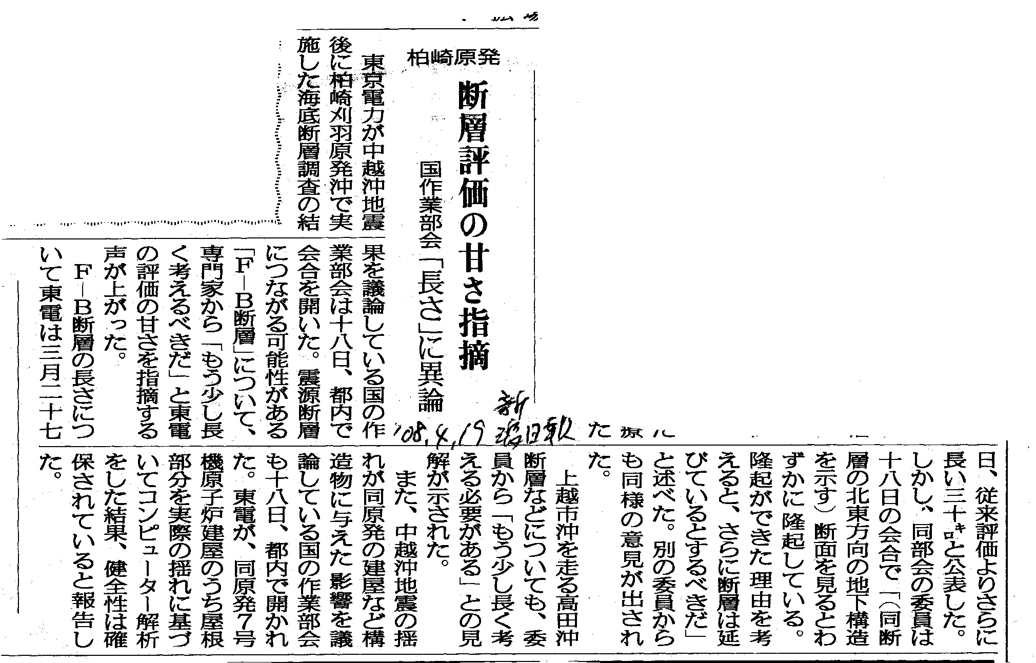 | [2008_04_19_01]柏崎原発 断層評価の甘さ指摘 国作業部会「長さ」に異論(新潟日報2008年4月19日) |