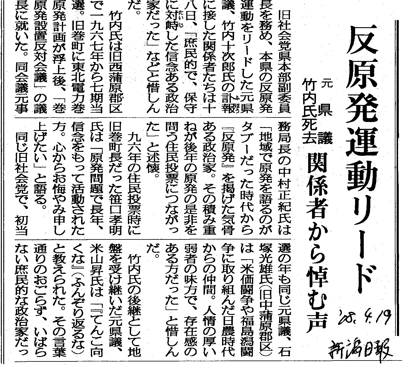 [2008_04_19_02]反原発運動リード 元県議竹内氏死去 関係者から悼む声(新潟日報2008年4月19日)