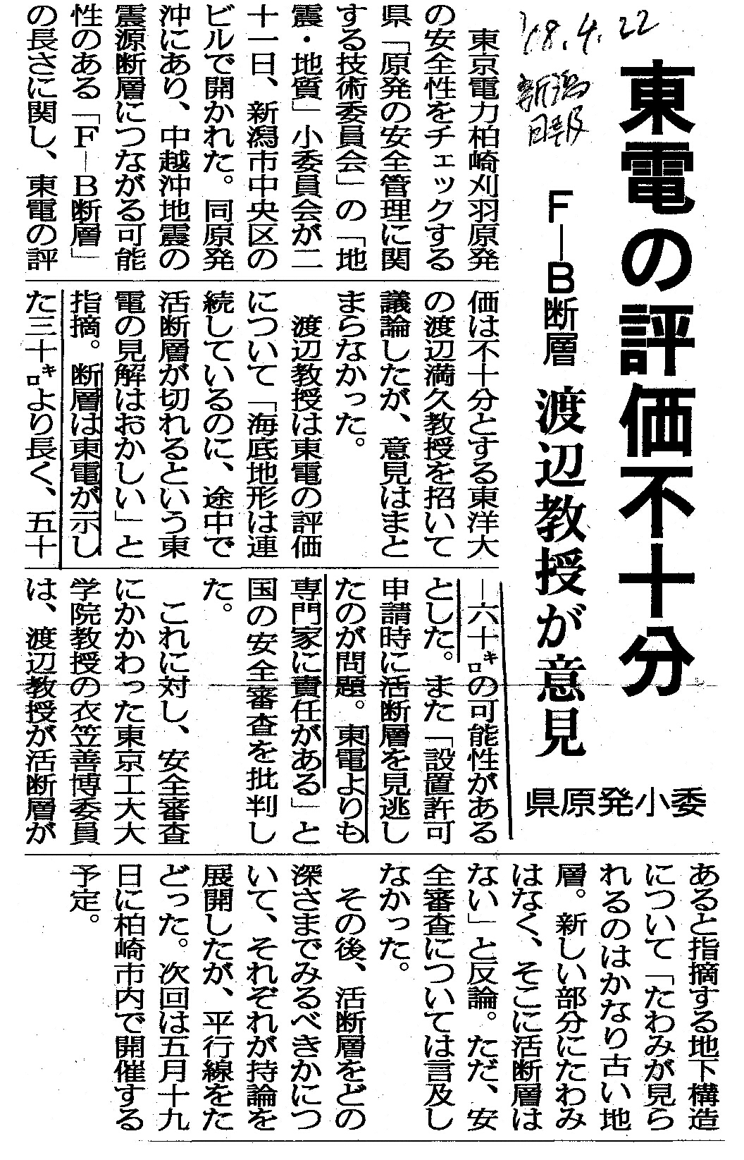 | [2008_04_22_01]東電の評価不十分 F-B断層 渡辺教授が意見 県原発小委(新潟日報2008年4月22日) |