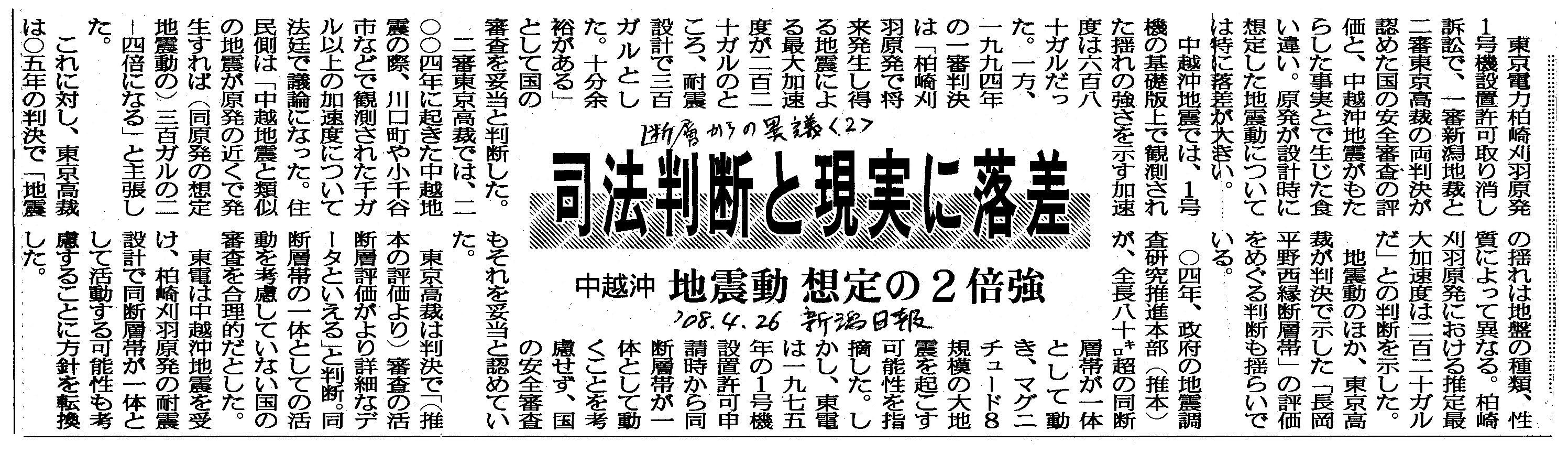 | [2008_04_26_02]司法判断と現実に落差 中越沖 地震動 想定の2倍強(新潟日報2008年4月26日) |