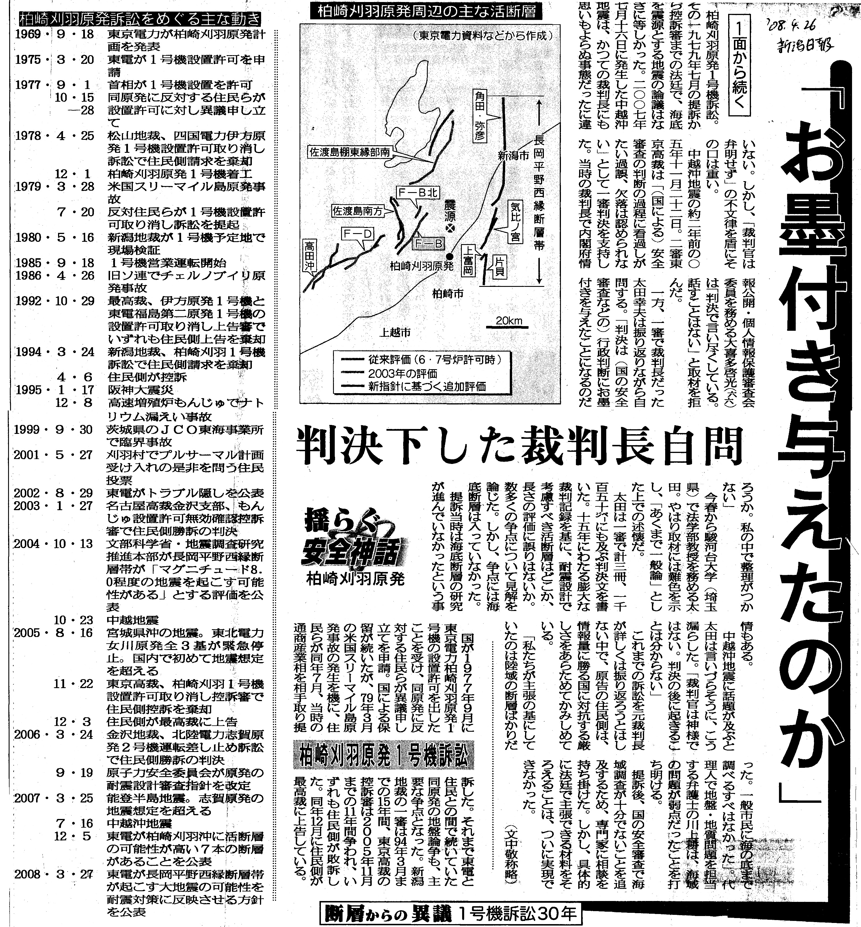 | [2008_04_26_04]揺らぐ安全神話 柏崎刈羽原発 断層からの異議 1号機訴訟30年 「お墨付き与えたのか」 判決下した裁判長自問 柏崎刈羽原発1号機訴訟(新潟日報2008年4月26日) |