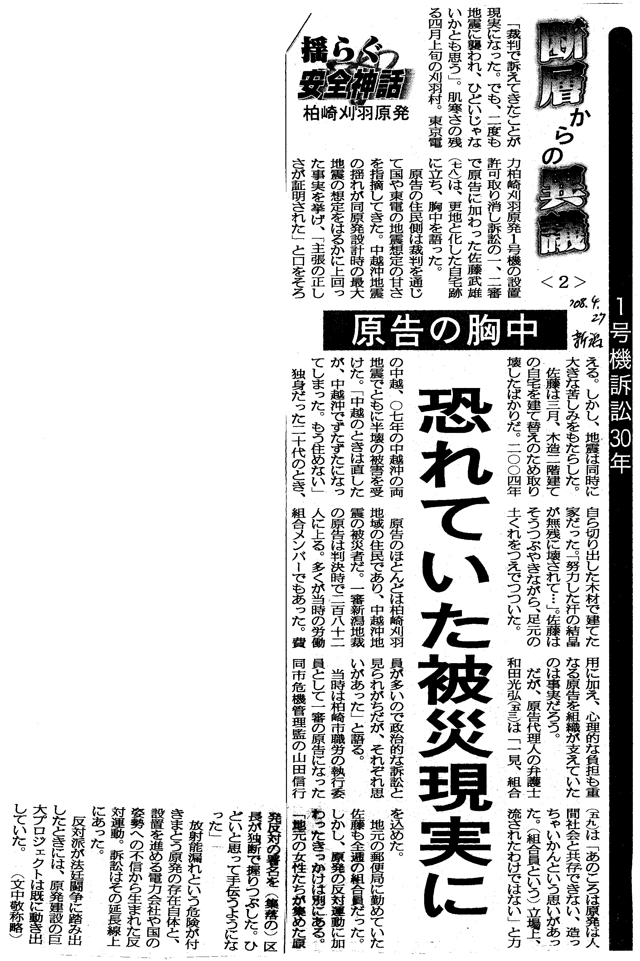 [2008_04_27_02]揺らぐ安全神話 柏崎刈羽原発 断層からの異議 1号機訴訟30年 <2> 原告の胸中 恐れていた被災現実に(新潟日報2008年4月27日)