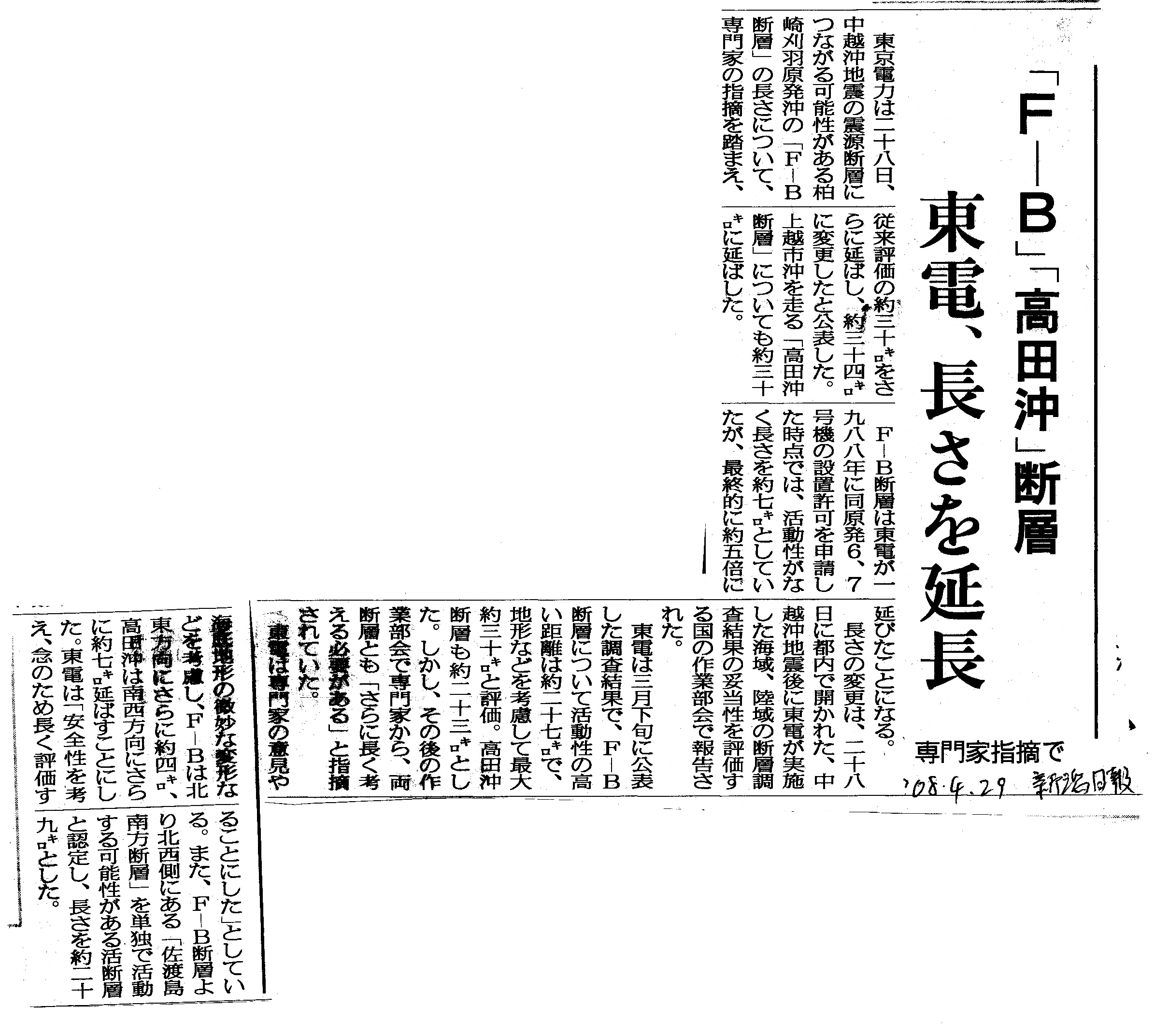 [2008_04_29_02]「F-B」「高田沖」断層 東電、長さを延長 専門家指摘で(新潟日報2008年4月29日)