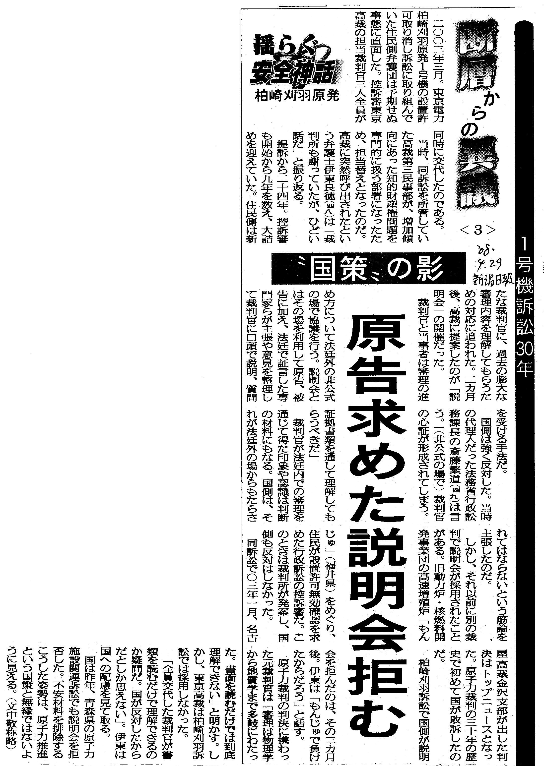 [2008_04_29_03]揺らぐ安全神話 柏崎刈羽原発 断層からの異議 1号機訴訟30年 <3> ”国策”の影 原告求めた説明会拒む(新潟日報2008年4月29日)