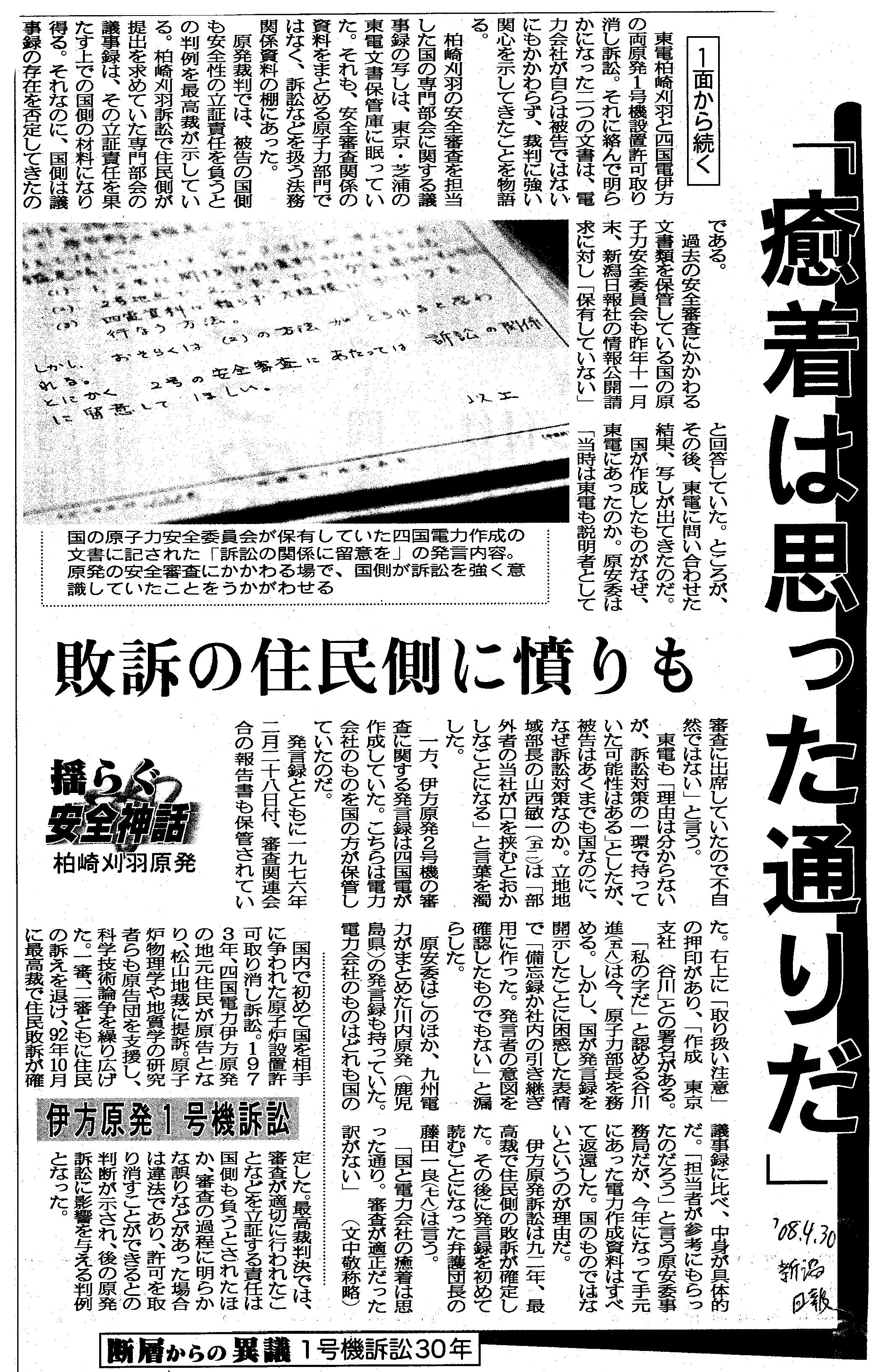 [2008_04_30_01]揺らぐ安全神話 柏崎刈羽原発 断層からの異議 1号機訴訟30年 「癒着は思った通りだ」 敗訴の住民側に憤りも 伊方原発1号機訴訟(新潟日報2008年4月30日)