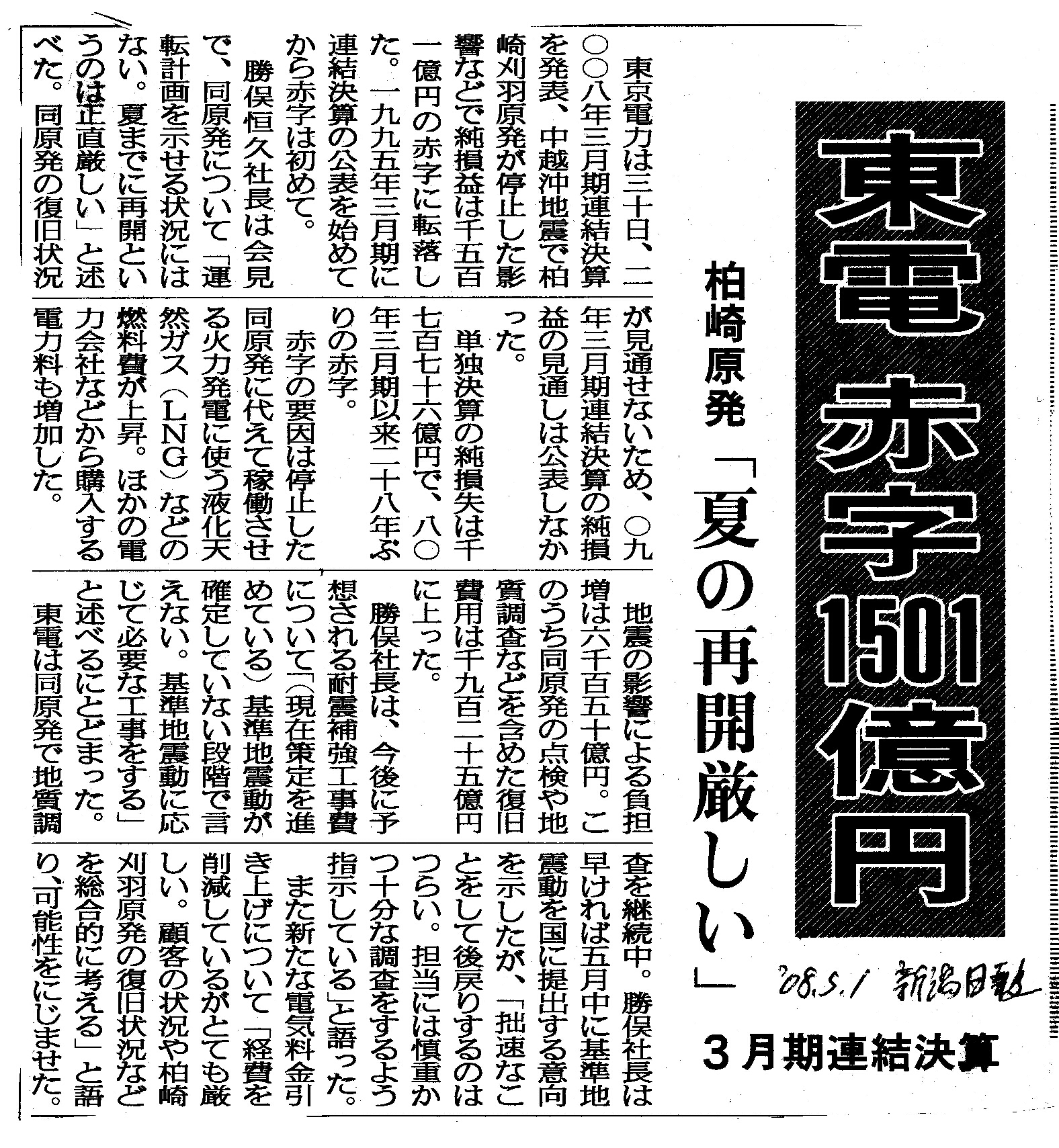 [2008_05_01_01]東電 赤字1501億円 柏崎原発 「夏の再開厳しい」 3月期連結予算(新潟日報2008年5月1日)