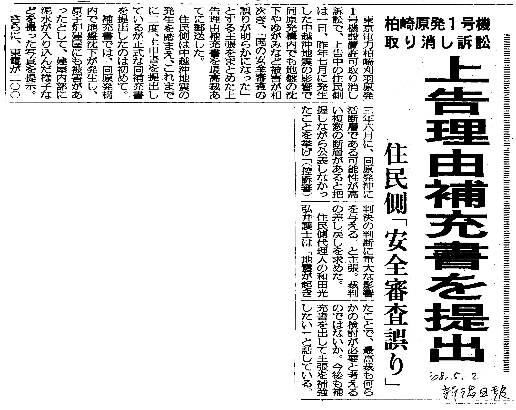 [2008_05_02_01]柏崎原発1号機取り消し訴訟 上告理由補充書を提出 住民側「安全審査誤り」(新潟日報2008年5月2日)