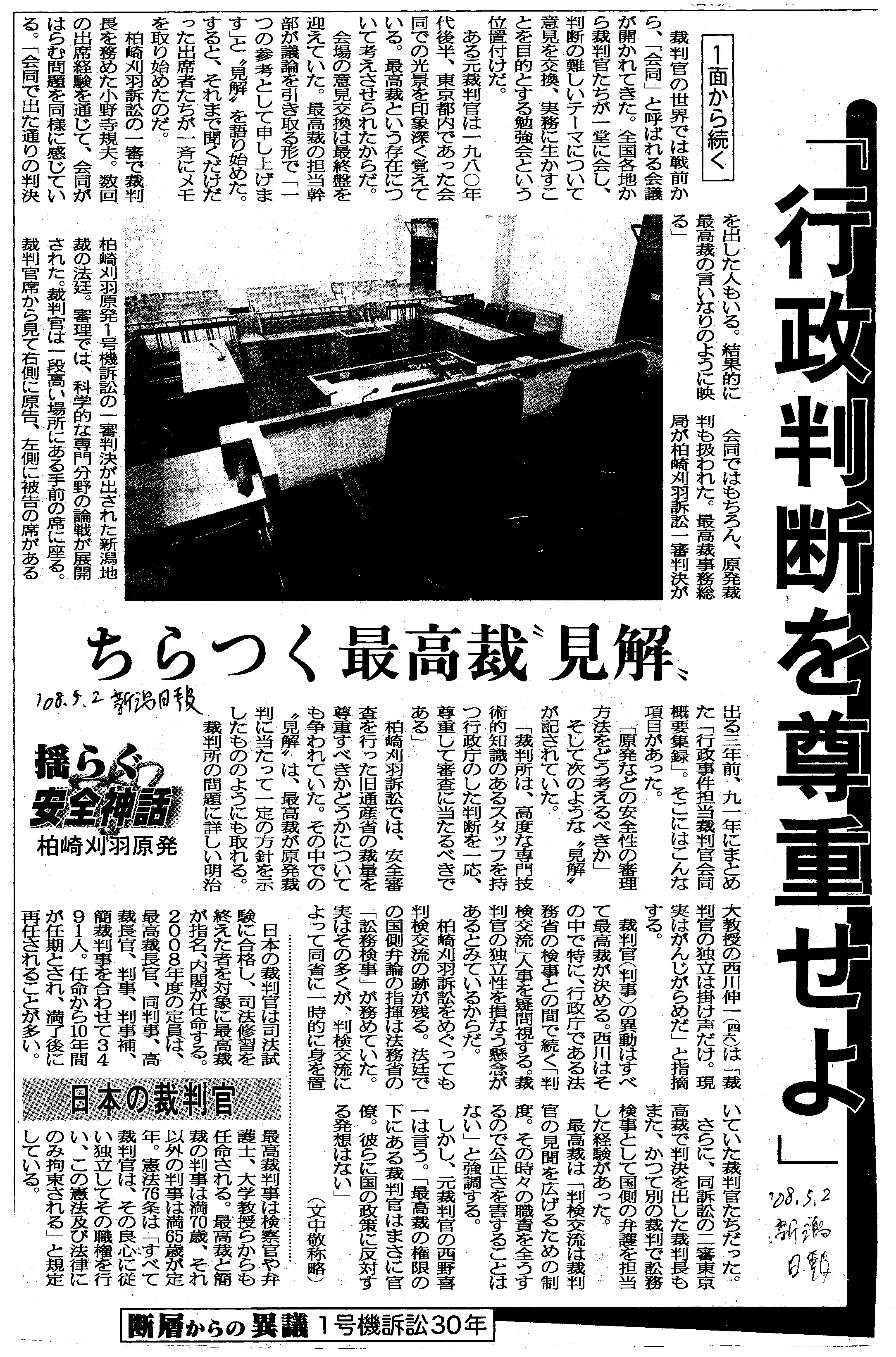 | [2008_05_02_02]揺らぐ安全神話 柏崎刈羽原発 断層からの異議 1号機訴訟30年 「行政判断を尊重せよ」 ちらつく最高裁”見解” 日本の裁判官(新潟日報2008年5月2日) |