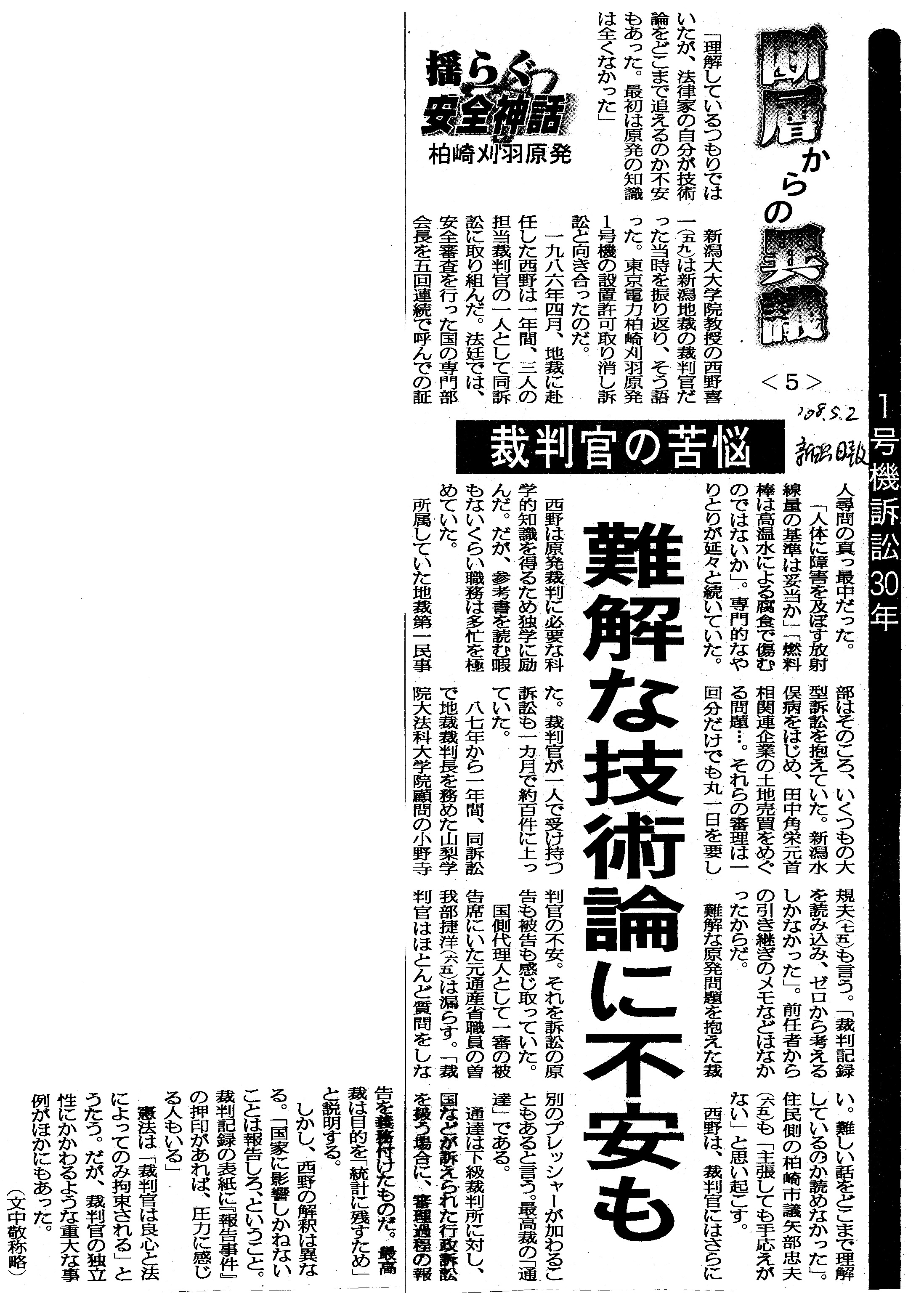 | [2008_05_02_03]揺らぐ安全神話 柏崎刈羽原発 断層からの異議 1号機訴訟30年 <5> 裁判官の苦悩 難解な技術論に不安も(新潟日報2008年5月2日) |