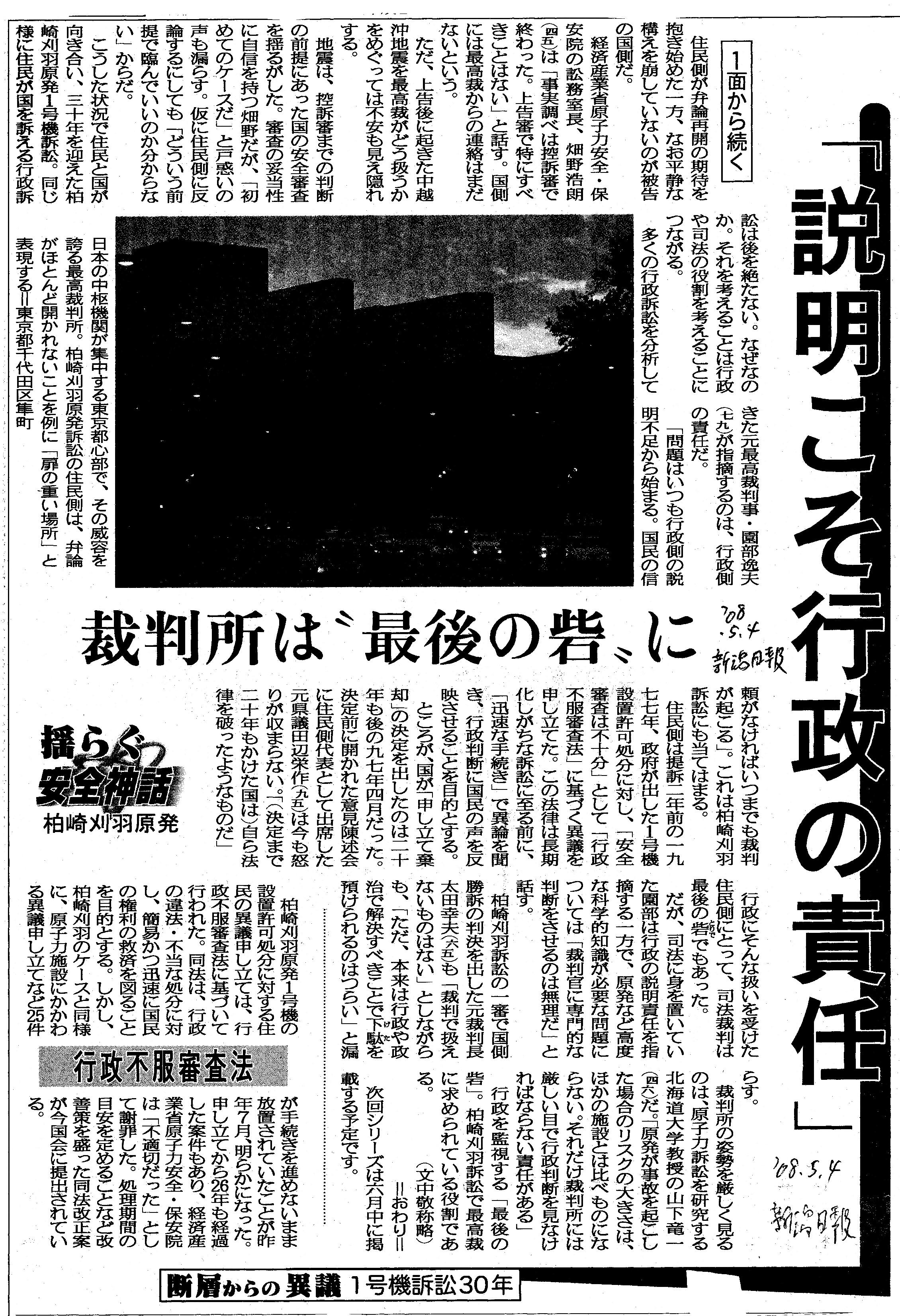 [2008_05_04_01]揺らぐ安全神話 柏崎刈羽原発 断層からの異議 1号機訴訟30年 「説明こそ行政の責任」 裁判所は”最後の砦”に(新潟日報2008年5月4日)