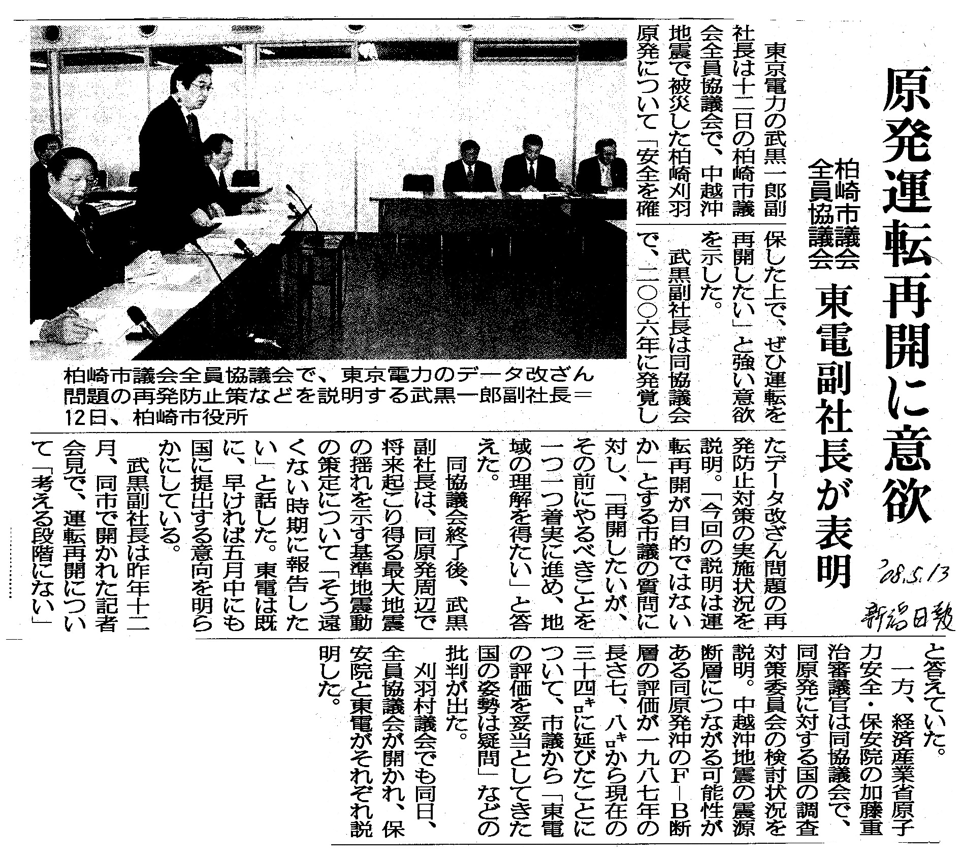 [2008_05_13_01]原発運転再開に意欲 柏崎市議会全員協議会 東電副社長が表明(新潟日報2008年5月13日)