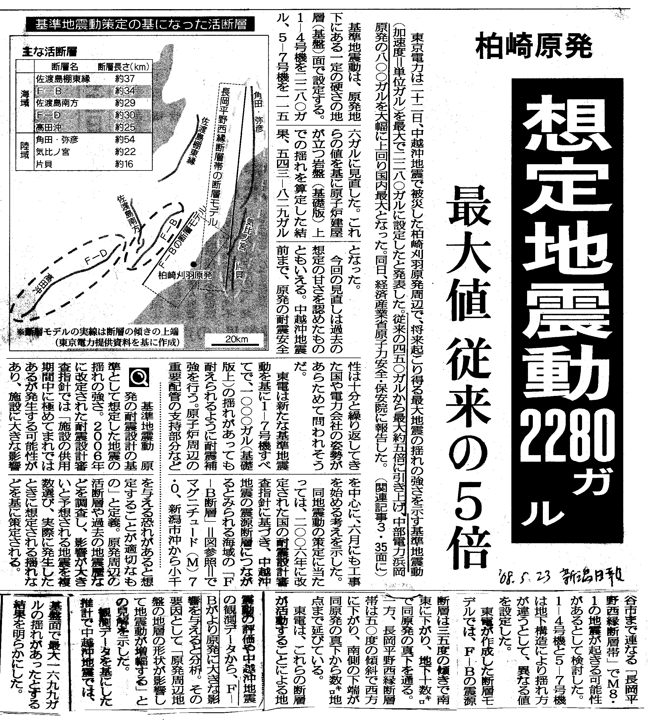 | [2008_05_23_02]柏崎原発 想定地震動2280ガル 最大値 従来の5倍 基準地震動(新潟日報2008年5月23日) |