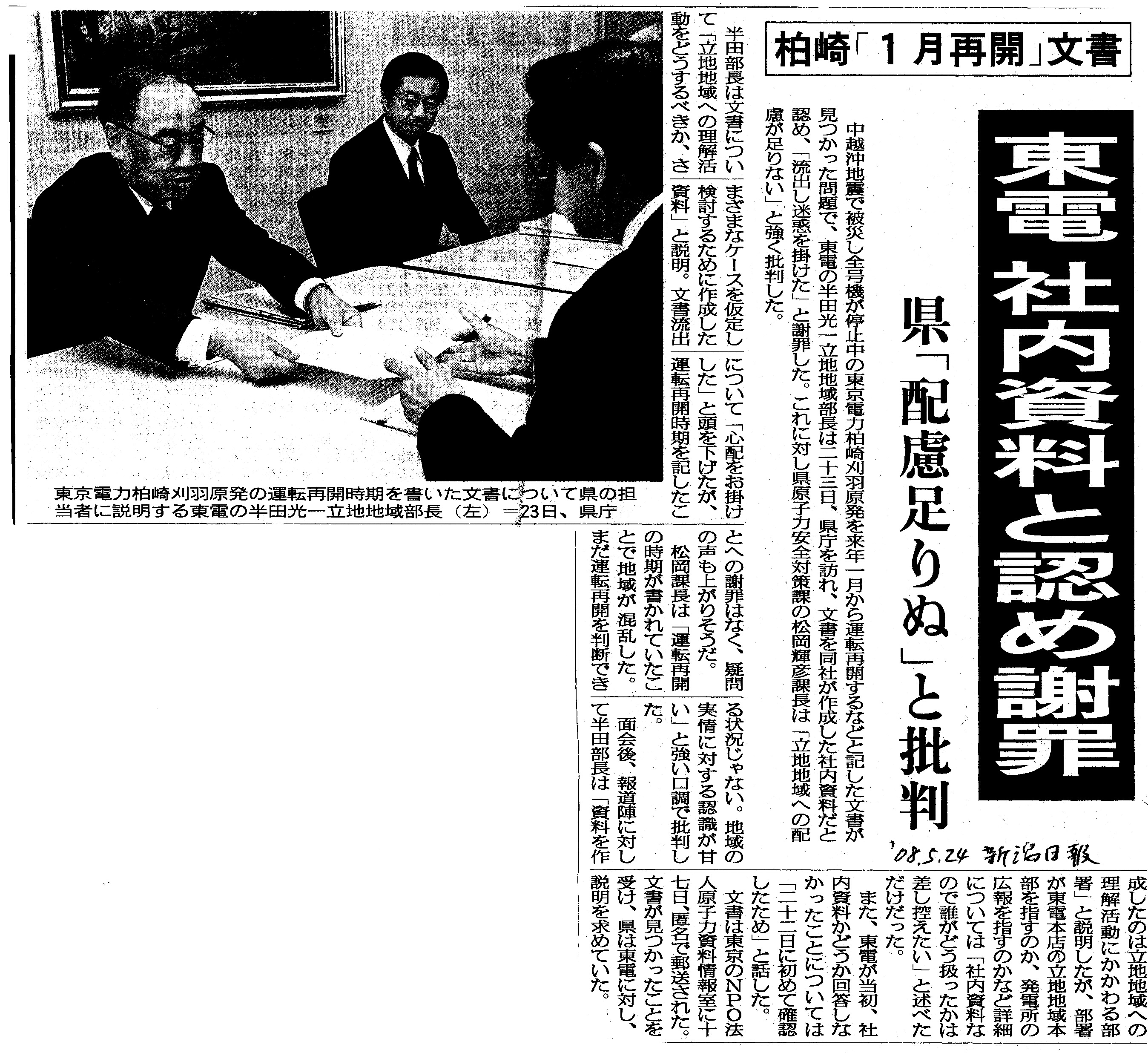 [2008_05_24_02]柏崎「1月再開」文書 東電 社内資料と認め謝罪 県「配慮足りぬ」と批判(新潟日報2008年5月24日)