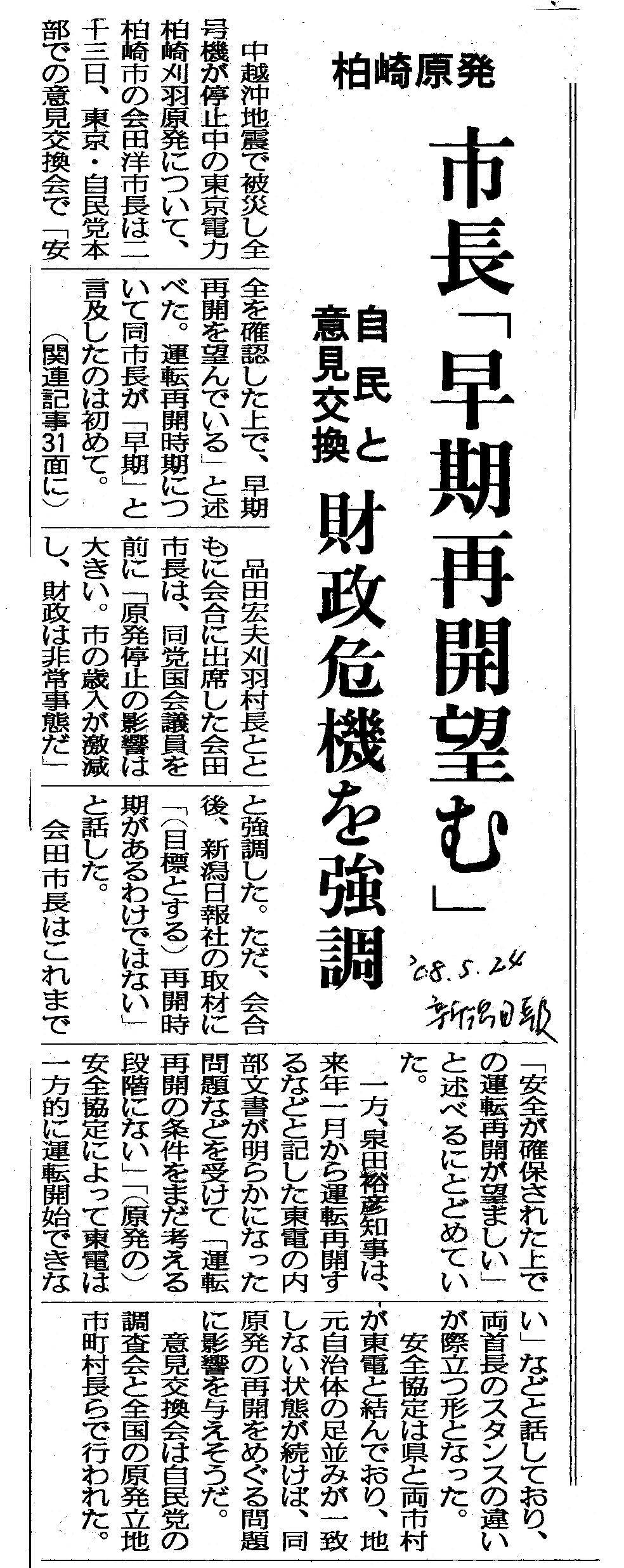 [2008_05_24_03]柏崎原発 市長「早期再開望む」 自民と意見交換 財政危機を強調(新潟日報2008年5月24日)
