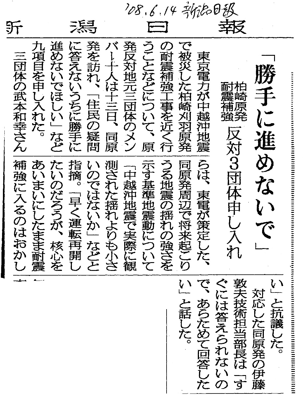 [2008_06_14_02]「勝手に進めないで」 柏崎原発耐震補強 反対3団体申し入れ(新潟日報2008年6月14日)