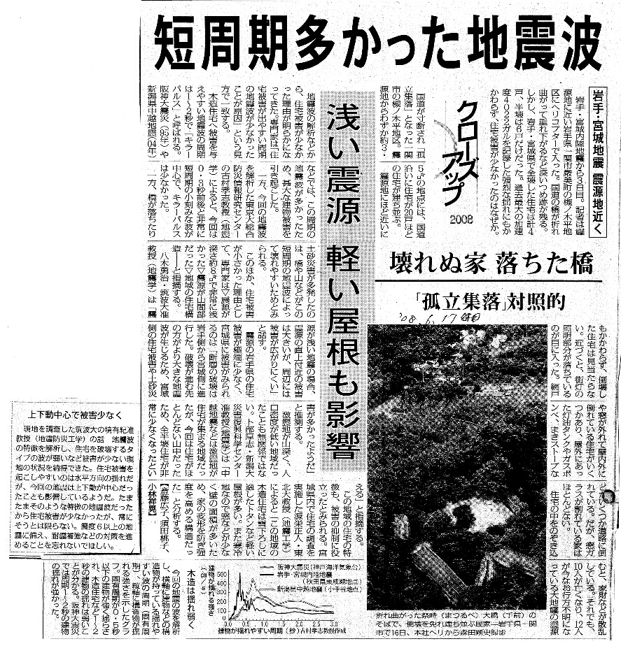| [2008_06_17_01]クローズアップ2008 岩手・宮城地震 震源地近く 短周期多かった地震波 浅い震源 軽い屋根も影響 壊れぬ家 落ちた橋 「孤立集落」対照的(毎日新聞2008年6月17日) |