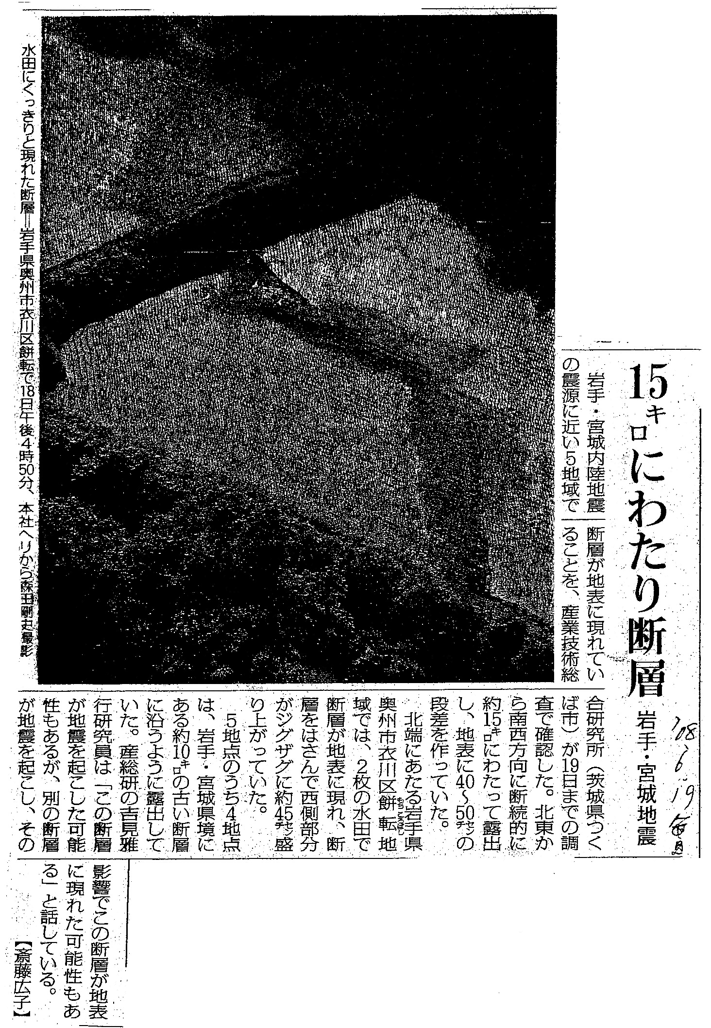 [2008_06_19_01]15キロにわたり断層 岩手・宮城地震(毎日新聞2008年6月19日)
