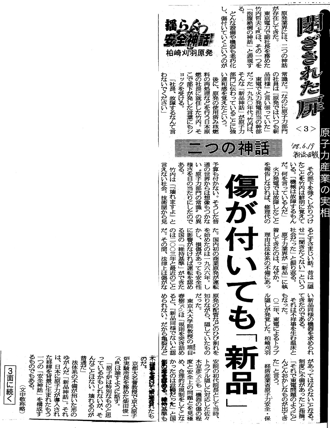 | [2008_06_19_03]揺らぐ安全神話 柏崎刈羽原発 閉ざされた扉<3> 原子力産業の実相 二つの神話 傷が付いても「新品」(新潟日報2008年6月19日) |