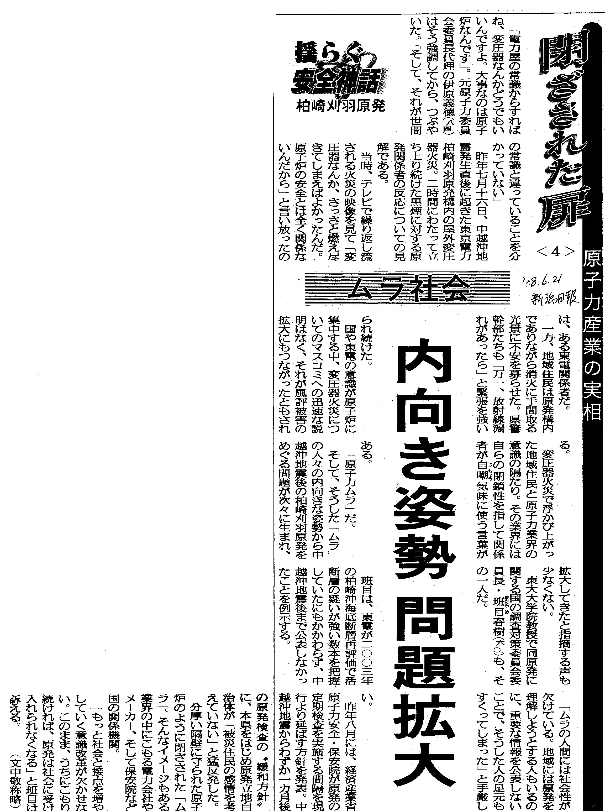 | [2008_06_21_01]揺らぐ安全神話 柏崎刈羽原発 閉ざされた扉<4> 原子力産業の実相 ムラ社会 内向き姿勢 問題拡大(新潟日報2008年6月21日) |