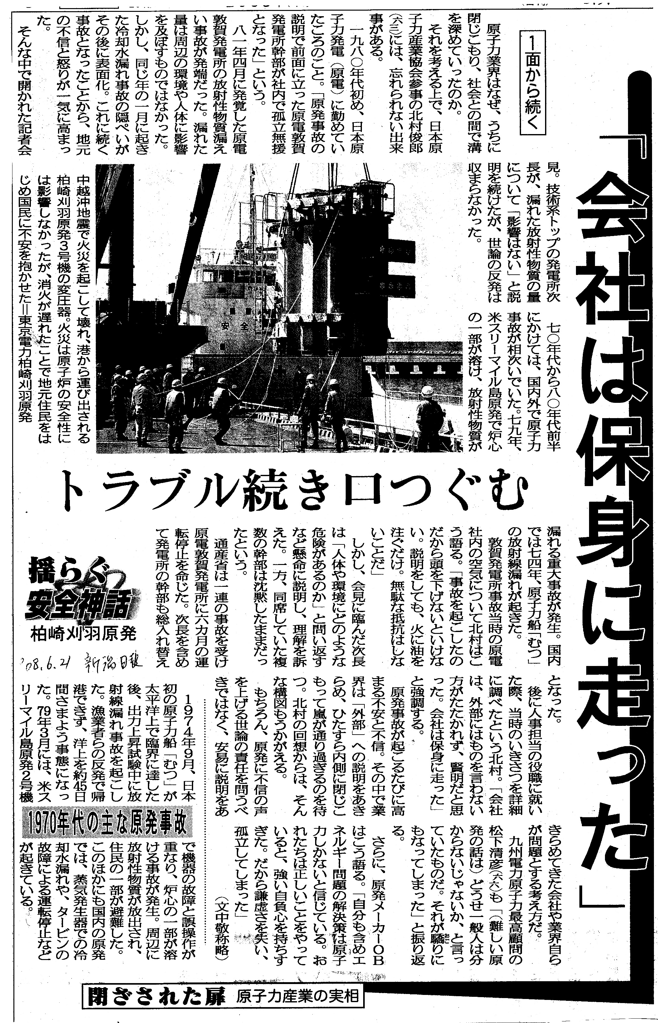 | [2008_06_21_02]揺らぐ安全神話 柏崎刈羽原発 閉ざされた扉 原子力産業の実相 「会社は保身に走った」 トラブル続き口つぐむ 1970年代の主な原発事故(新潟日報2008年6月21日) |