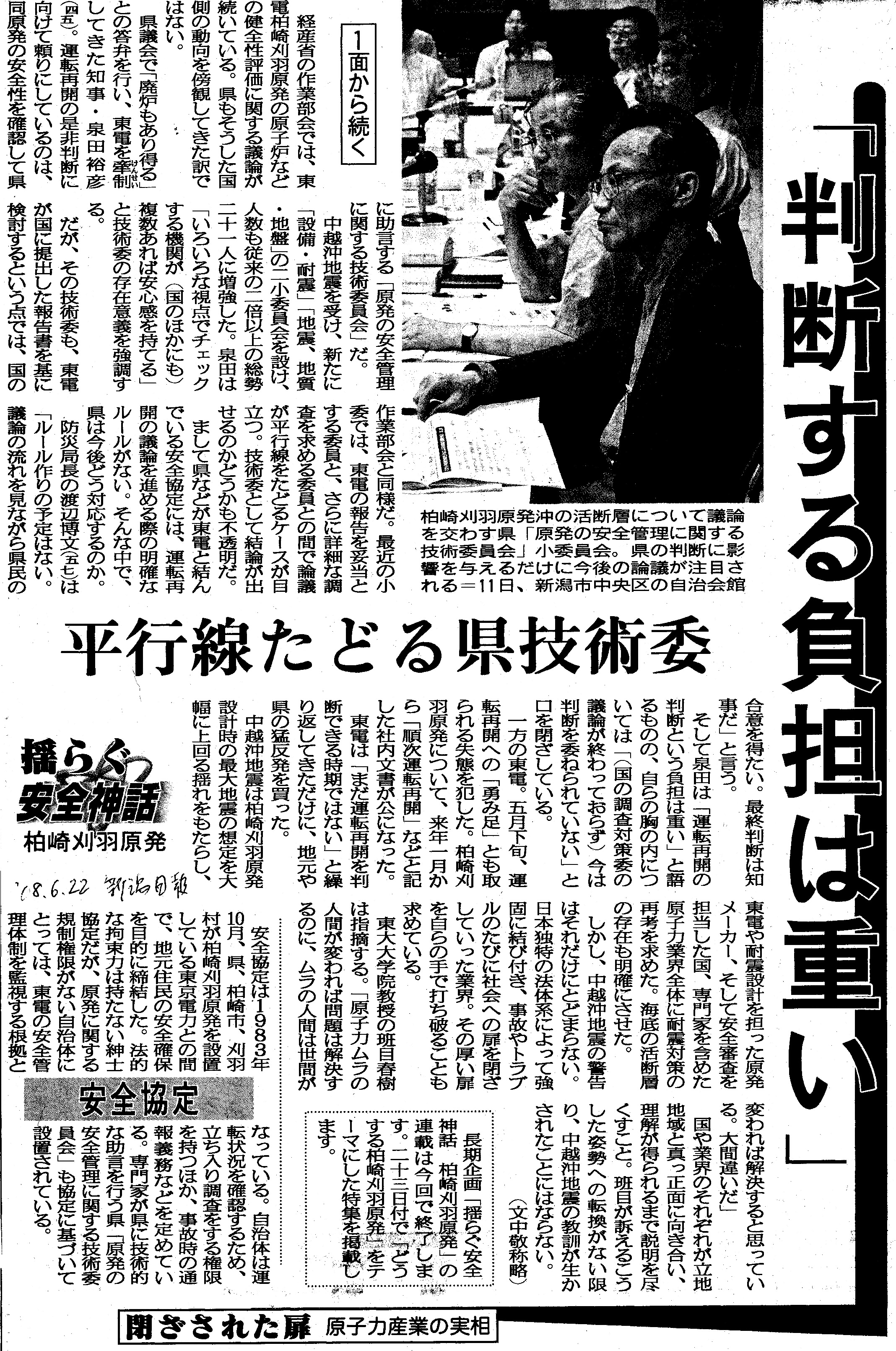 [2008_06_22_01]揺らぐ安全神話 柏崎刈羽原発 閉ざされた扉 原子力産業の実相 「判断する負担は重い」 平行線たどる県技術委(新潟日報2008年6月22日)