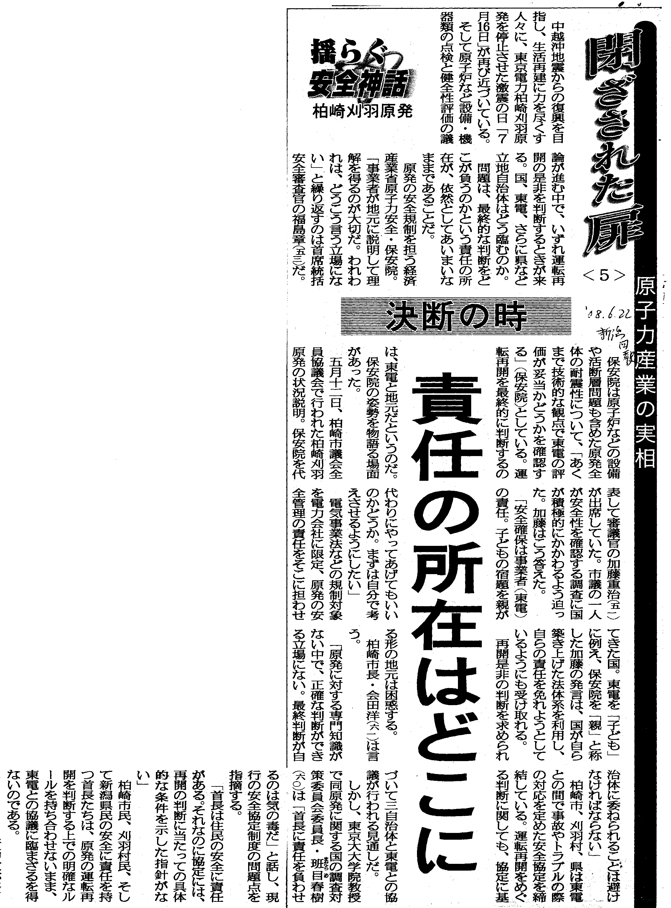 [2008_06_22_02]揺らぐ安全神話 柏崎刈羽原発 閉ざされた扉<5> 原子力産業の実相 決断の時 責任の所在はどこに(新潟日報2008年6月22日)