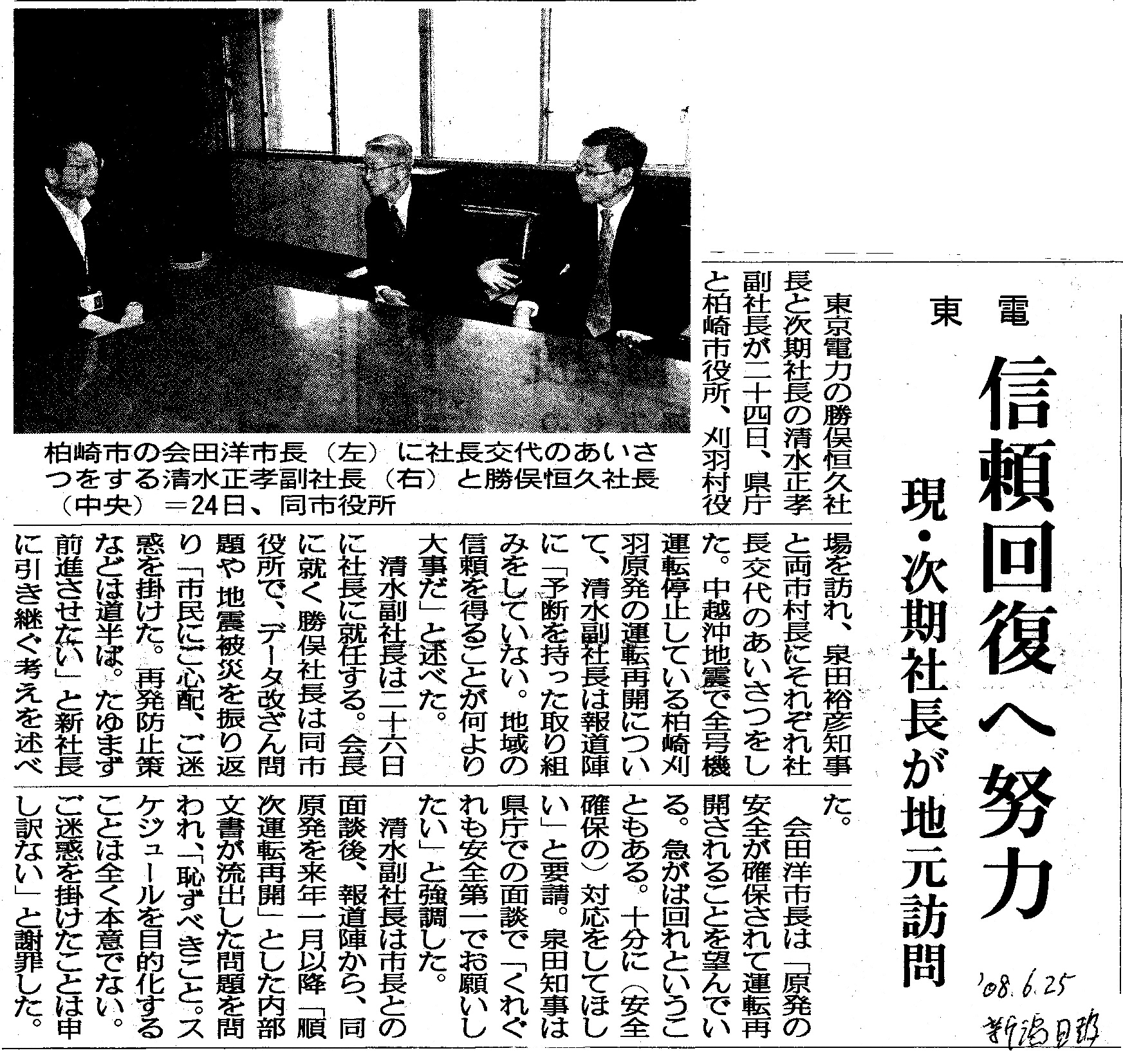 [2008_06_25_01]東電 信頼回復へ努力 現・次期社長が地元訪問(新潟日報2008年6月25日)