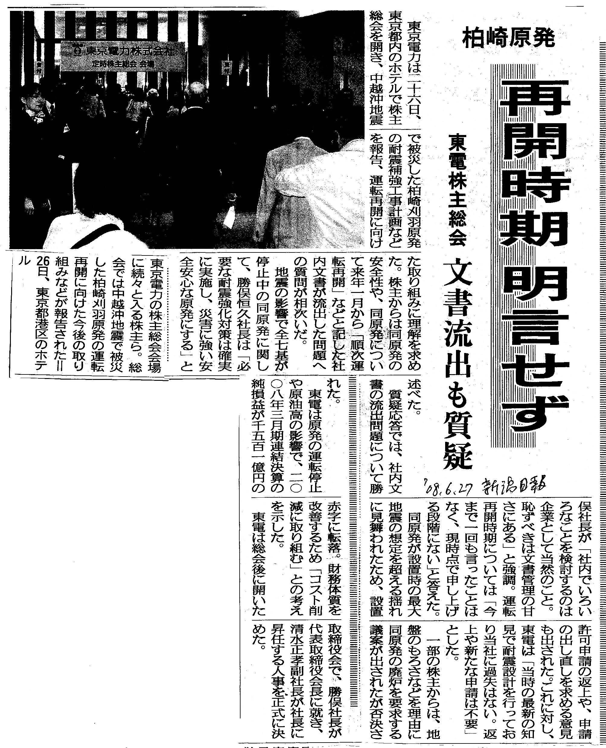 [2008_06_27_01]柏崎原発 再開時期明言せず 東電株主総会 文書流出も質疑(新潟日報2008年6月27日)