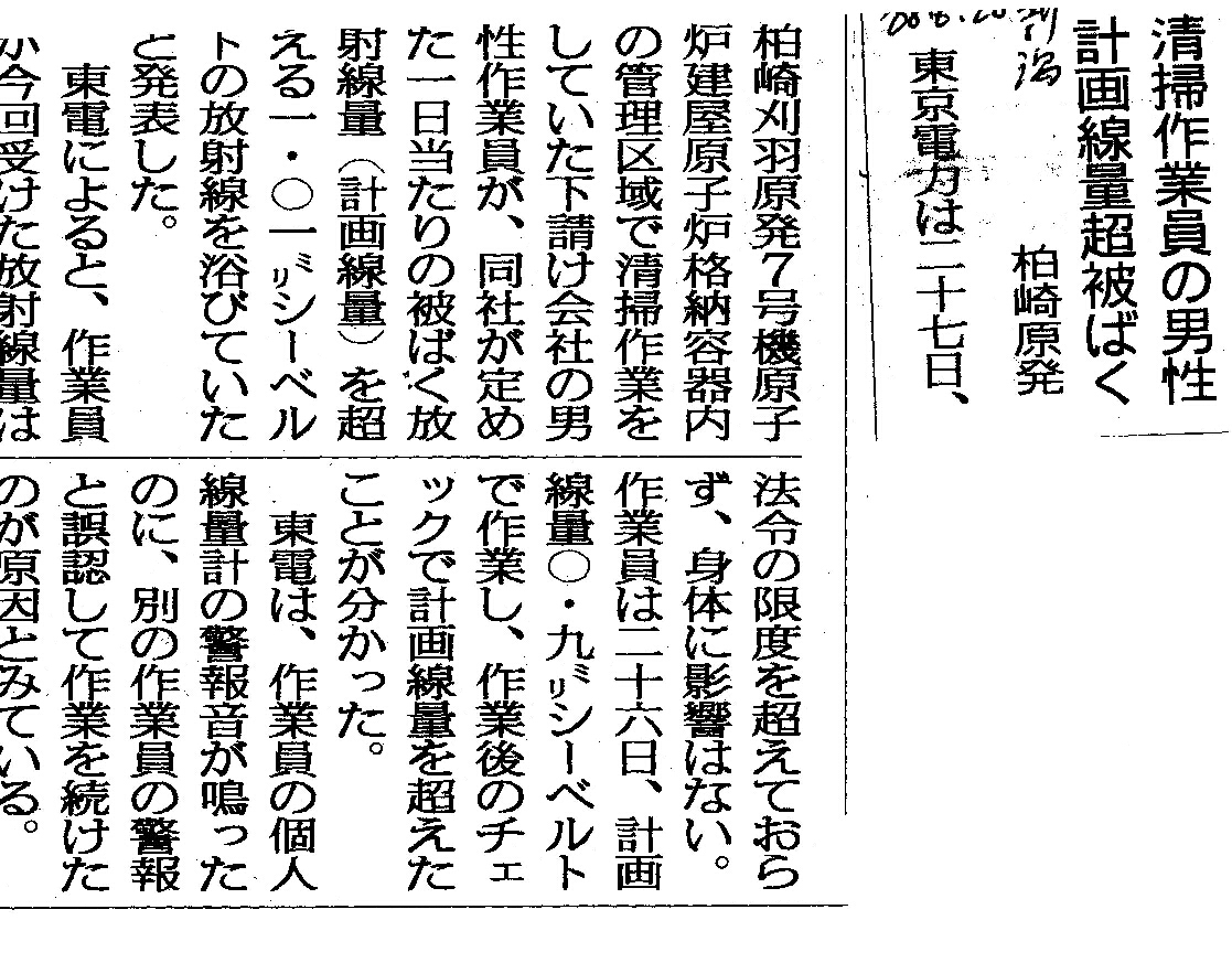 [2008_06_28_03]清掃作業員の男性 計画線量超被ばく 柏崎原発(新潟日報2008年6月28日)