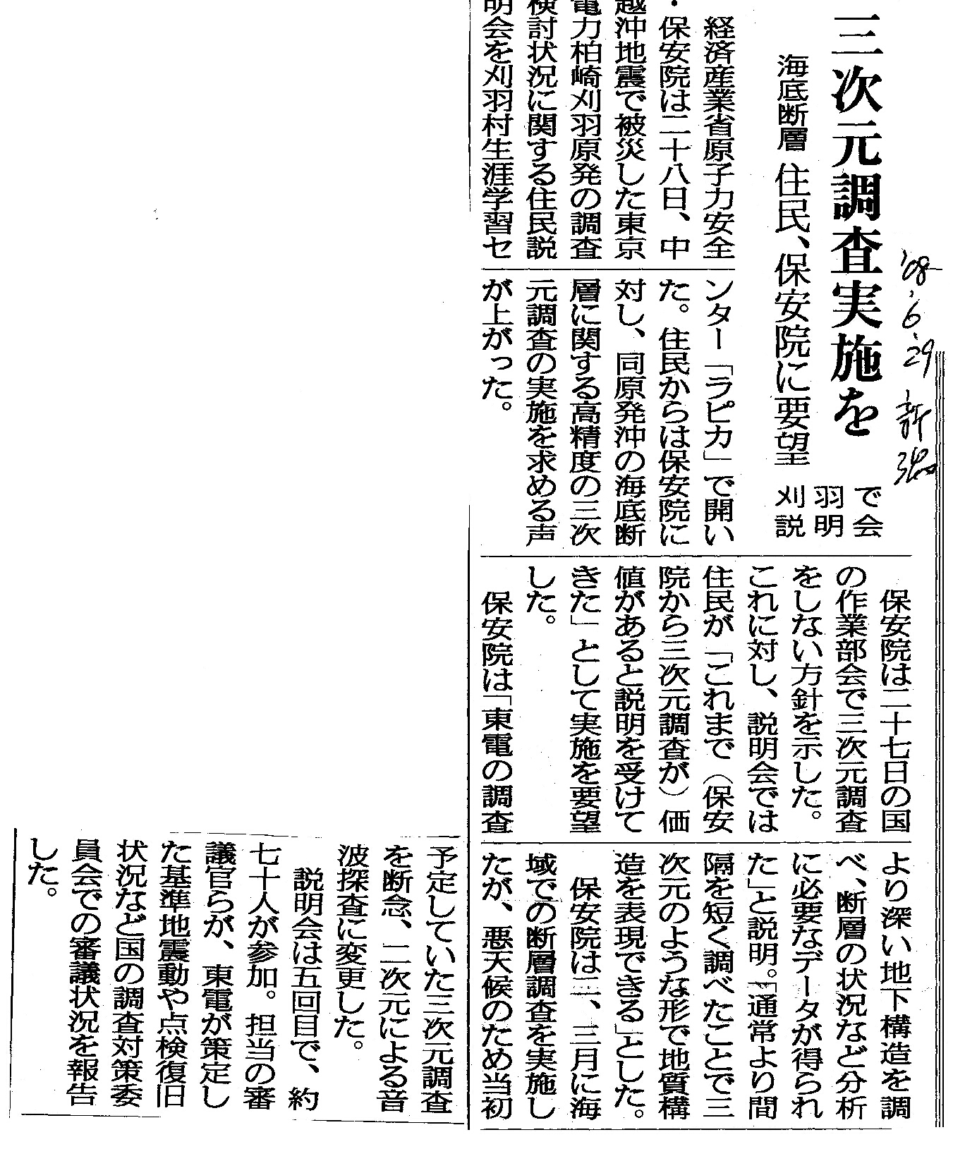 [2008_06_29_02]三次元調査実施を 海底断層 住民、保安院に要望 刈羽で説明会(新潟日報2008年6月29日)
