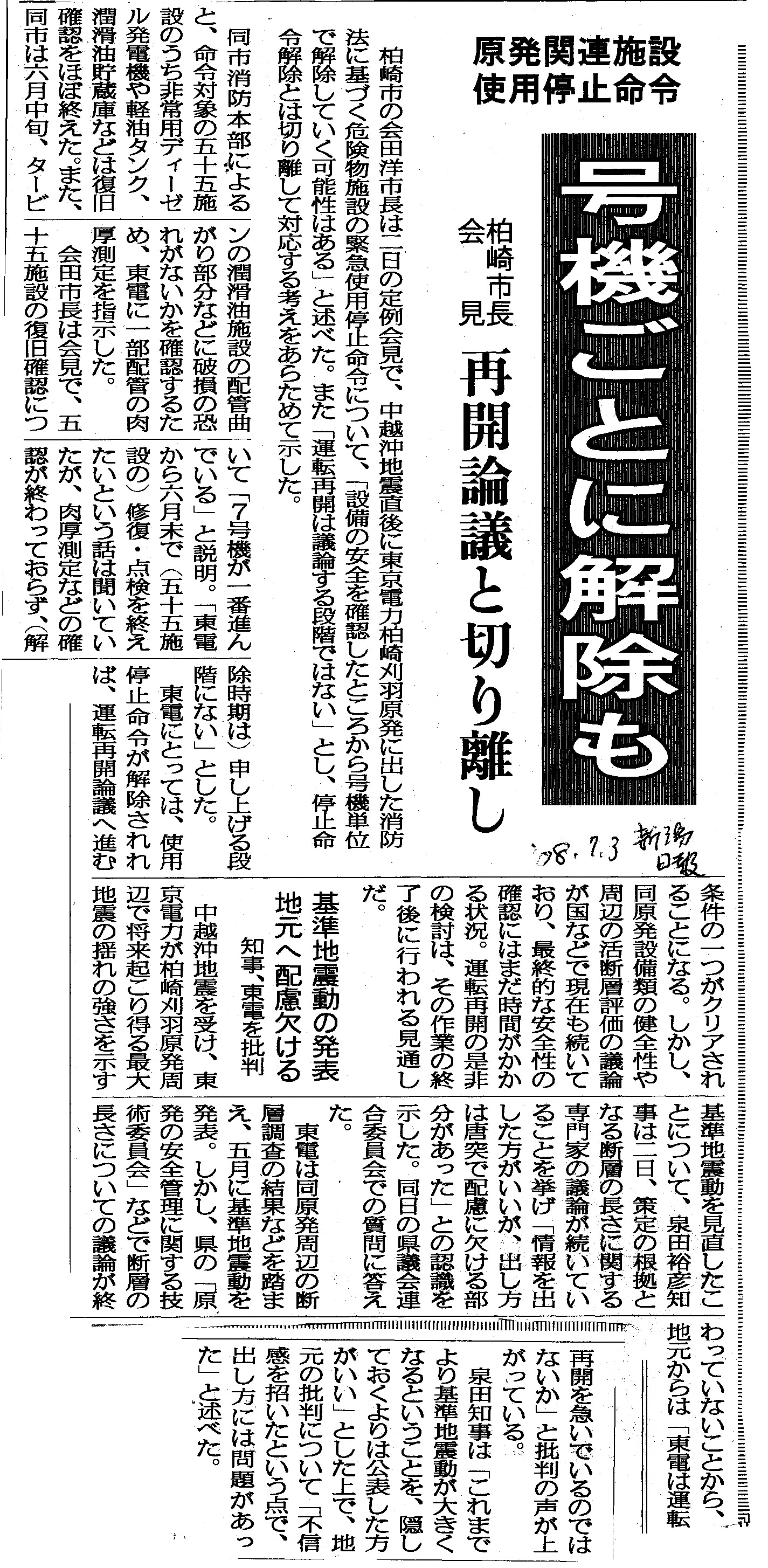 [2008_07_03_01]原発関連施設使用停止命令 号機ごとに解除も 柏崎市長会見 再開論議と切り離し 基準地震動の発表地元へ配慮欠ける 知事、東電を批判(新潟日報2008年7月3日)