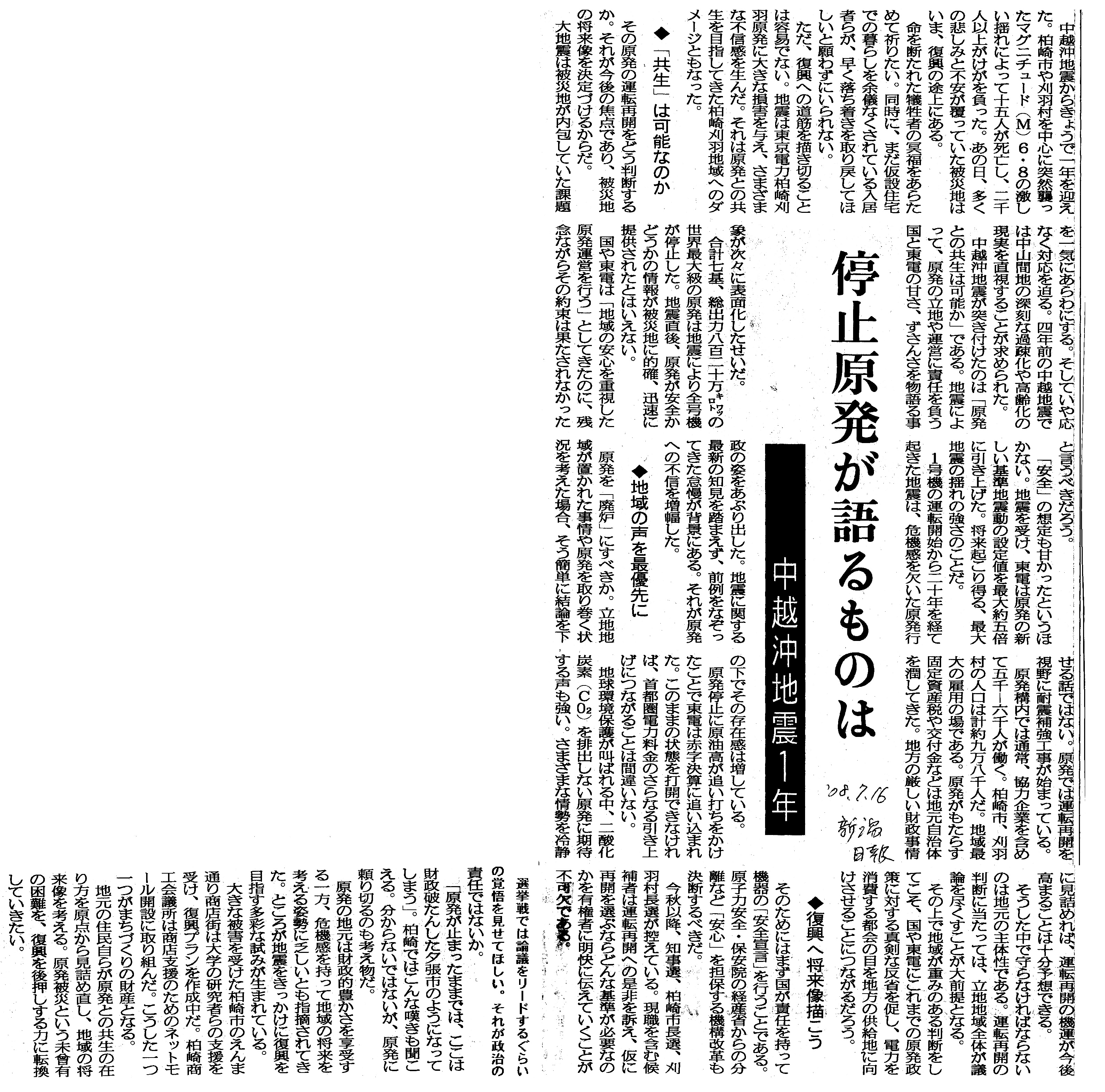 [2008_07_16_01]停止原発が語るものは 中越沖地震1年 「共生」は可能なのか 地域の声を最優先に 復興へ将来像描こう(新潟日報2008年7月16日)