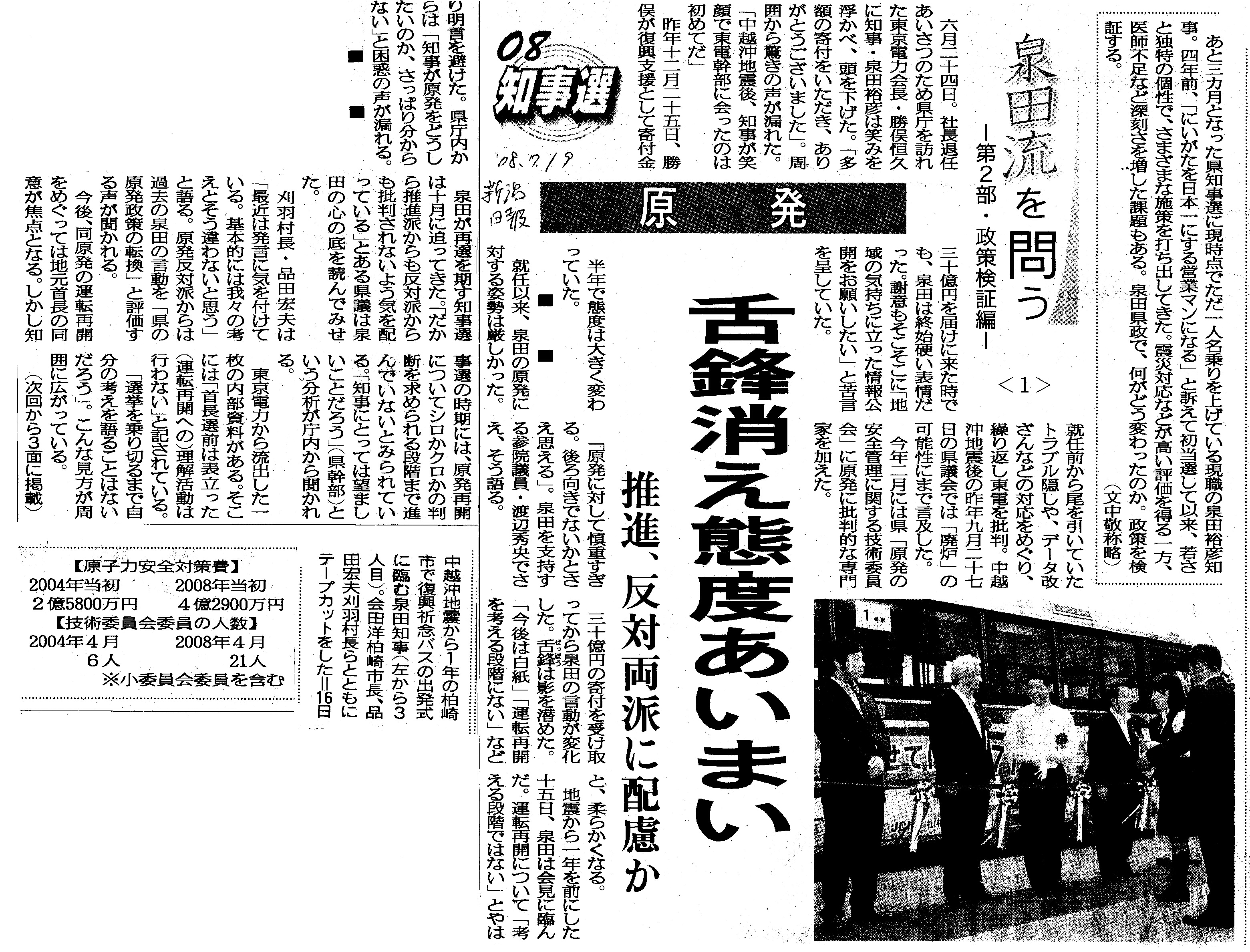 [2008_07_19_01]08知事選 原発 泉田流を問う 第2部・政策検証辺 舌鋒消え態度あいまい 推進、反対両派に配慮か(新潟日報2008年7月19日)
