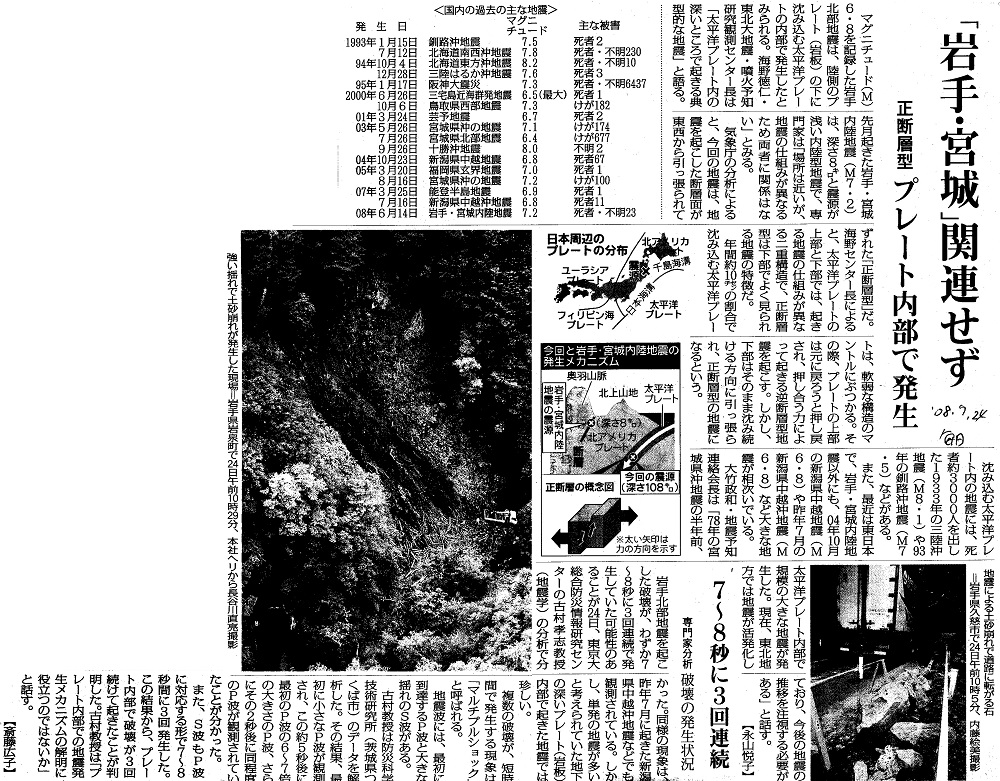 | [2008_07_24_06]「岩手・宮城」関連せず 正断層型 プレート内部で発生 7〜8秒に3回連続 専門家分析 破壊の発生状況(毎日新聞2008年7月24日) |