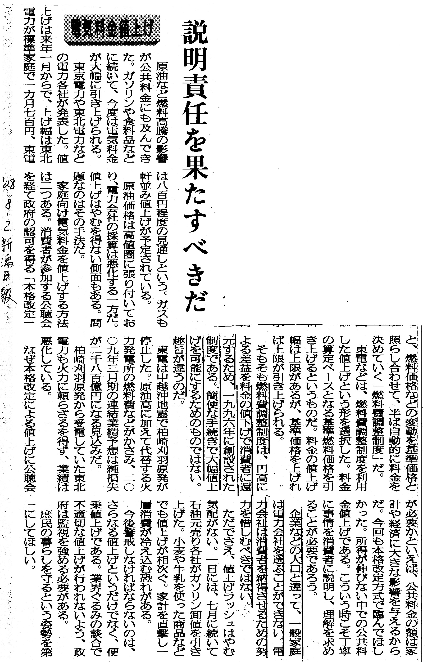 [2008_08_02_01]電気料金値上げ 説明責任果たすべきだ(新潟日報2008年8月2日)