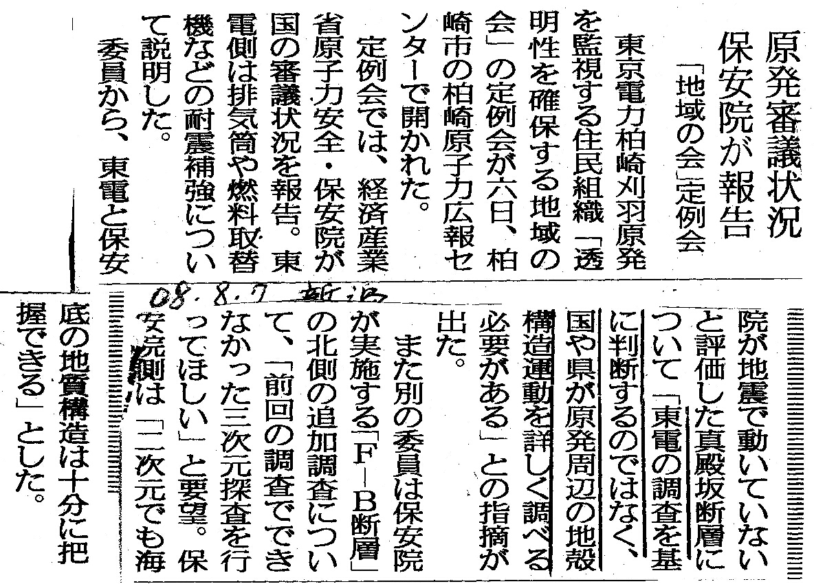| [2008_08_07_01]原発審議状況 保安院が報告 「地域の会」定例会(新潟日報2008年8月7日) |