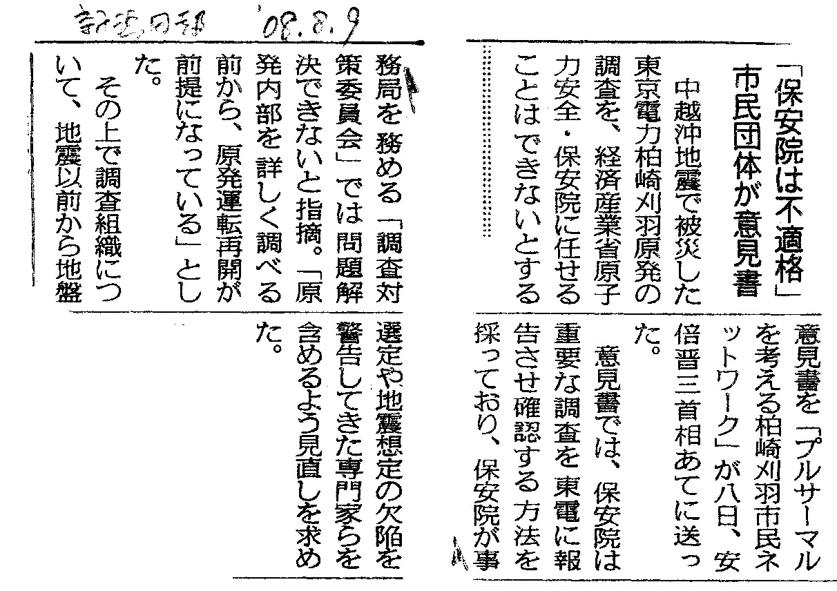 [2008_08_09_01]「保安院は不適格」 市民団体が意見書(新潟日報2008年8月9日)