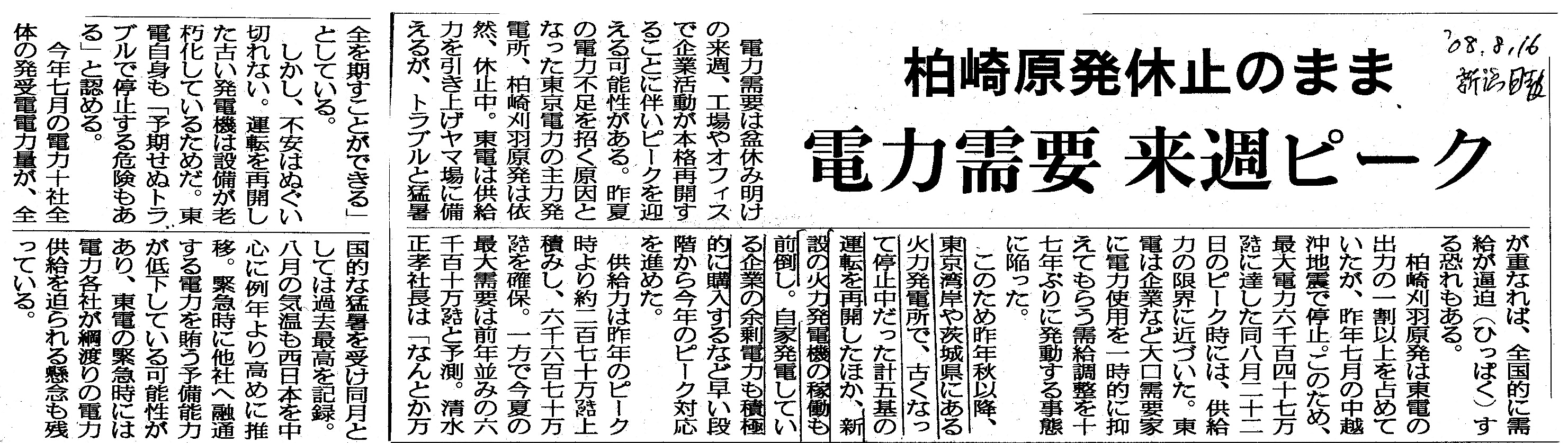[2008_08_16_01]柏崎原発休止のまま 電力需要 来週ピーク(新潟日報2008年8月16日)