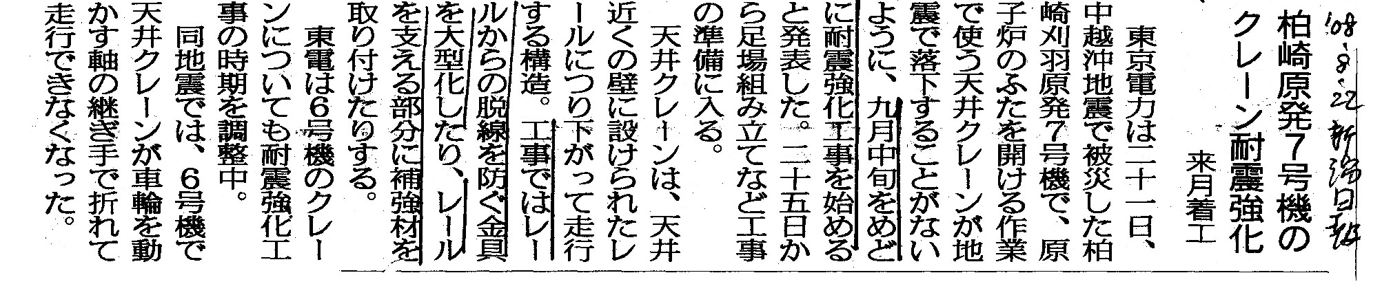 [2008_08_22_01]柏崎原発7号機のクレーン耐震強化 来月着工(新潟日報2008年8月22日)