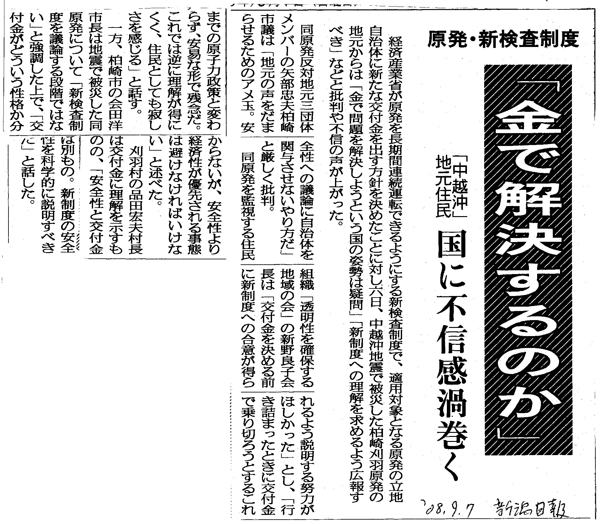 [2008_09_07_01]原発・新検査制度 「金で解決するのか」 「中越沖」地元住民 国に不信感渦巻く(新潟日報2008年9月7日)
