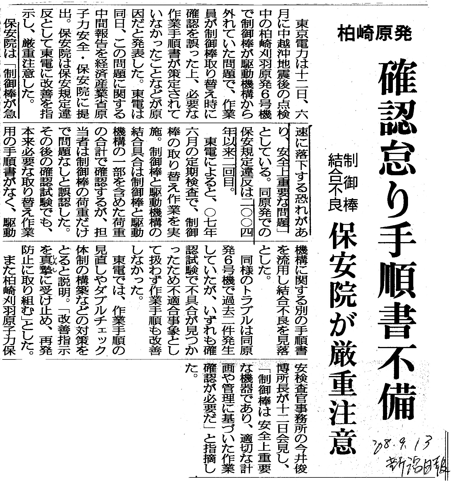 [2008_09_13_01]柏崎原発 確認怠り手順書不備 制御棒結合不良 保安院が厳重注意(新潟日報2008年9月13日)