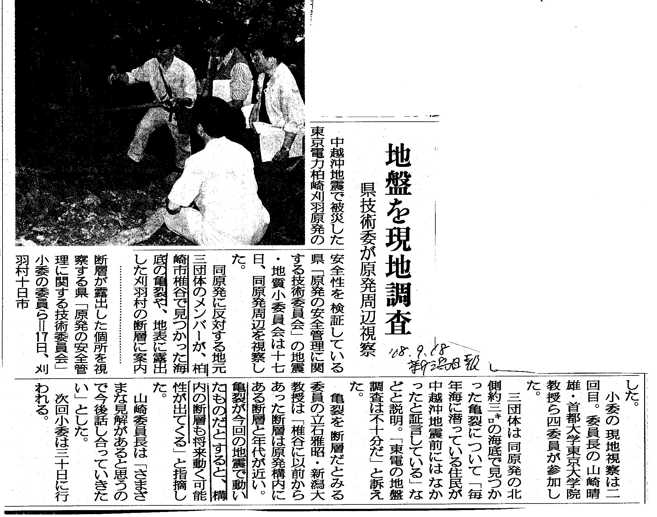 | [2008_09_18_01]地盤を現地調査 県技術委が原発周辺視察(新潟日報2008年9月18日) |
