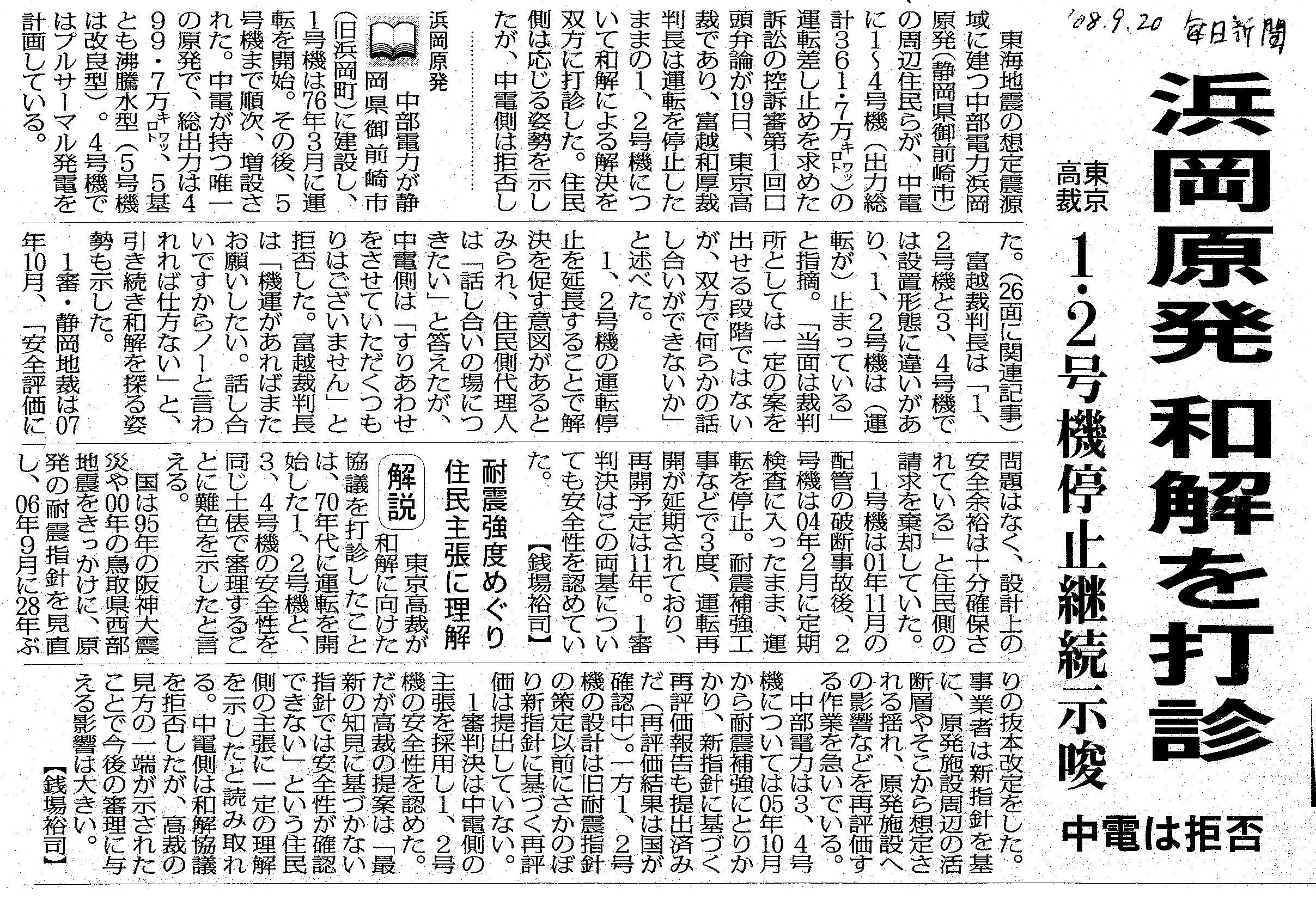 [2008_09_20_01]浜岡原発 和解を打診 東京高裁 1・2号機停止継続示唆 中電は拒否(毎日新聞2008年9月20日)