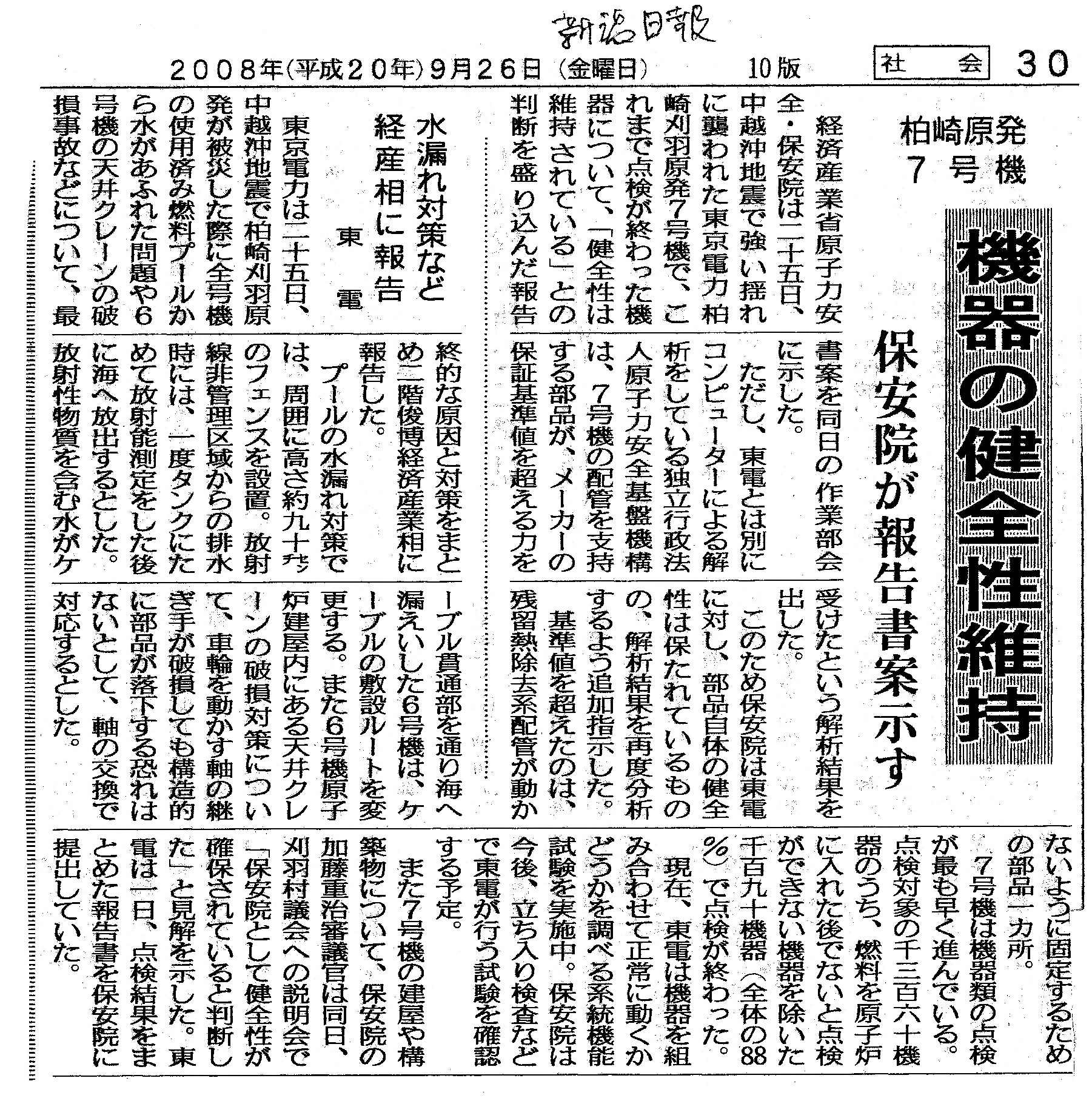 | [2008_09_26_01]柏崎刈羽7号機 機器の健全性維持 保安院が報告書案示す 水漏れ対策など経産相に報告 東電(新潟日報2008年9月26日) |