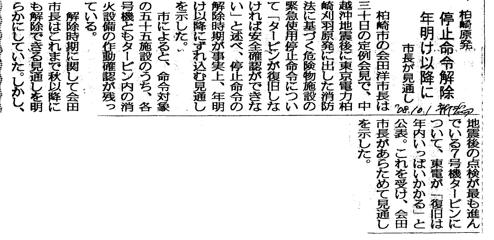 [2008_10_01_02]柏崎原発 停止命令解除年明け以降に 市長が見通し(新潟日報2008年10月1日)